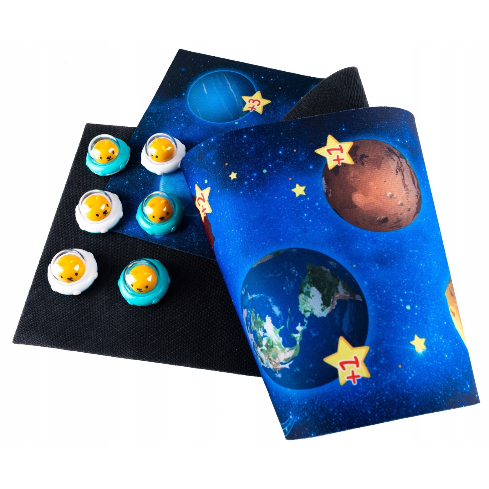 Osrednji del tega kompleta je posebna podloga, ki prikazuje Osončje v vsej njegovi veličini – od bleščečega Sonca do skrivnostnih planetov, ki vas vabijo k raziskovanju. Ta fascinantna umetnina ne spodbuja le domišljije in radovednosti, temveč otroke na zabaven in interaktiven način uči osnov astronomije.