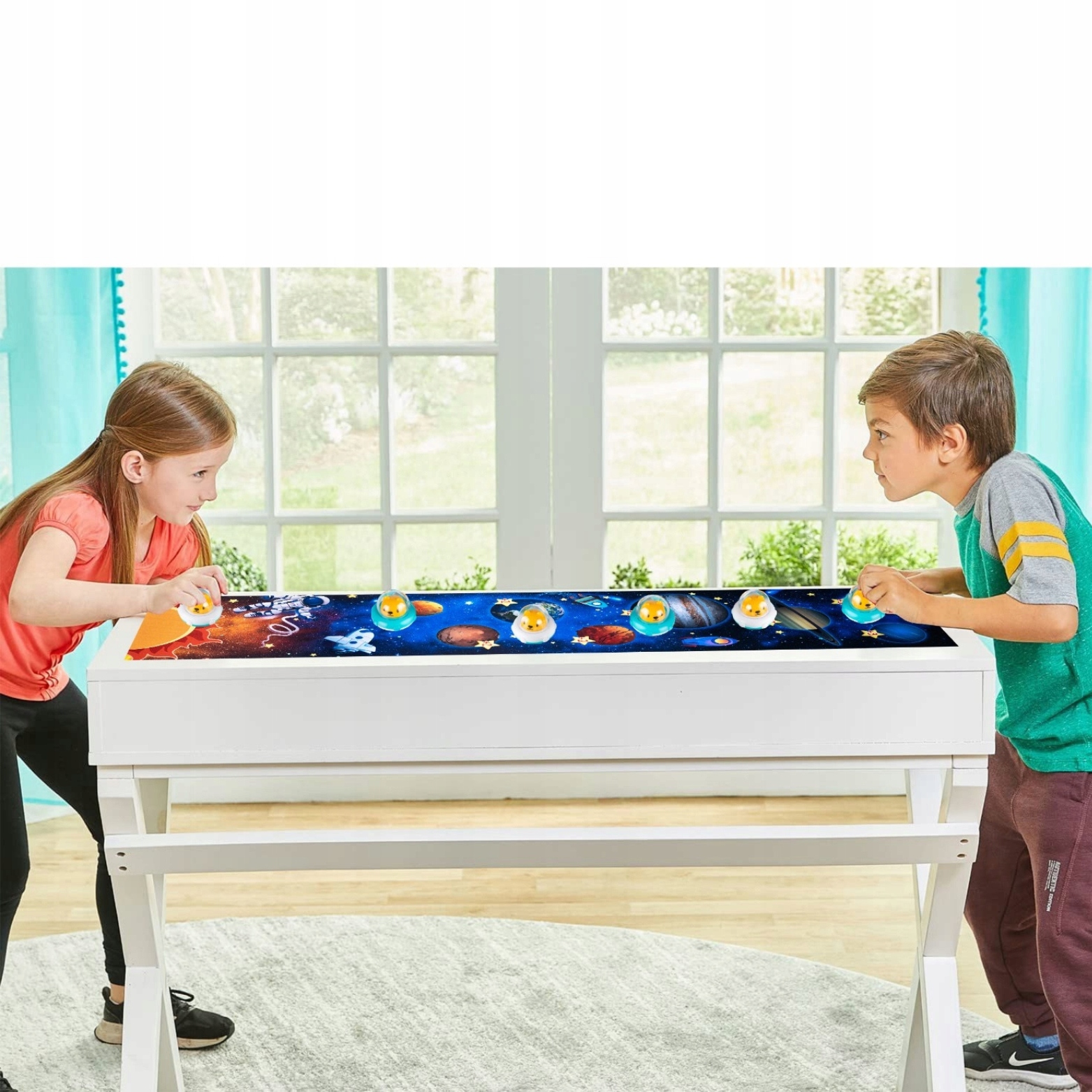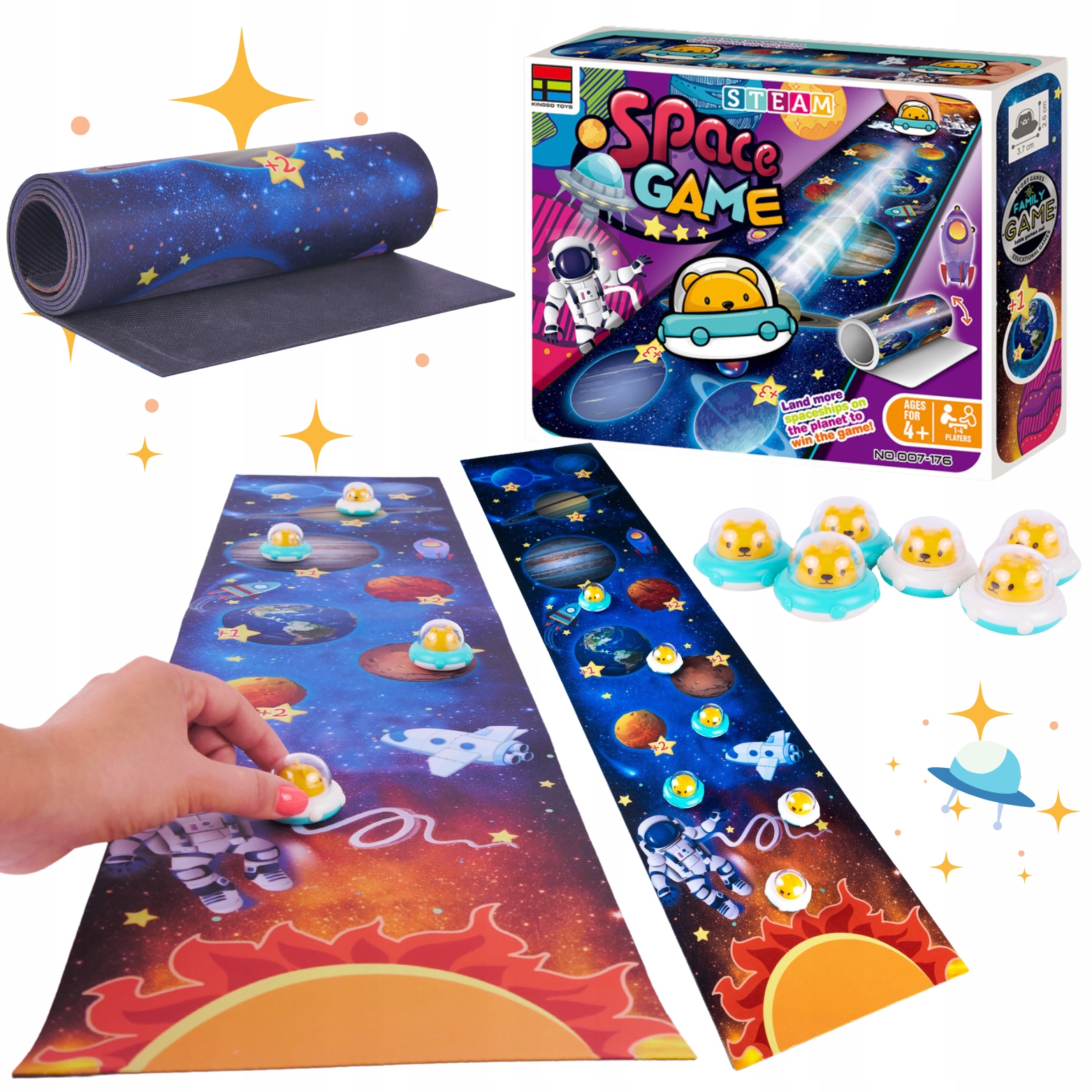 Za dokončanje te vesoljske pustolovščine komplet vključuje 6 diskov v obliki vesoljskih ladij , ki jih igralci uporabljajo za premikanje po blazini in poskušajo doseči čim več točk ter postati prvak v vesoljskem curlingu.
