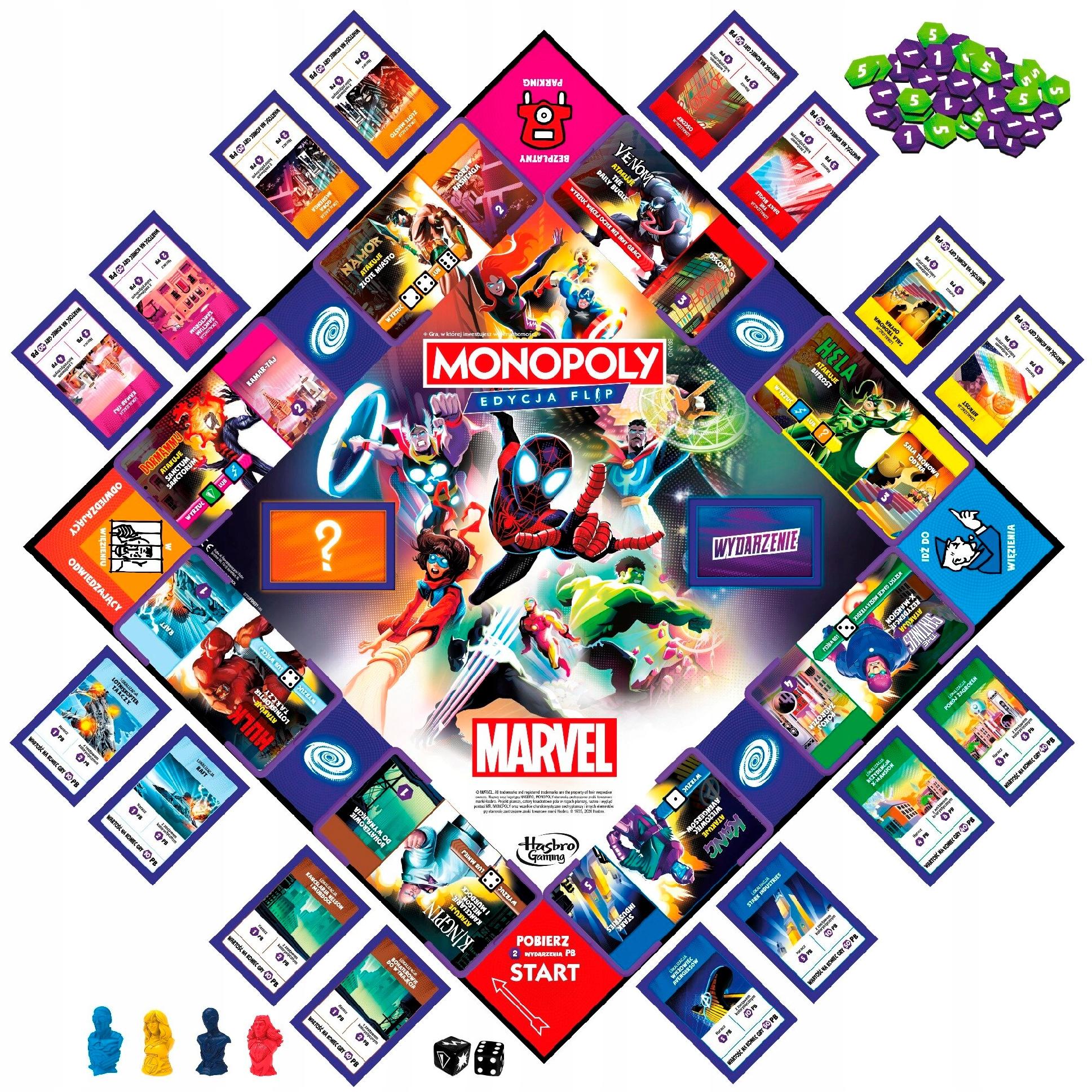 Potopite se v Marvelov svet z Monopoly Flip Edition: Marvelova družabna igra! Z priljubljenimi Marvelovimi junaki in zlikovci, znanimi lokacijami in vznemirljivimi temami