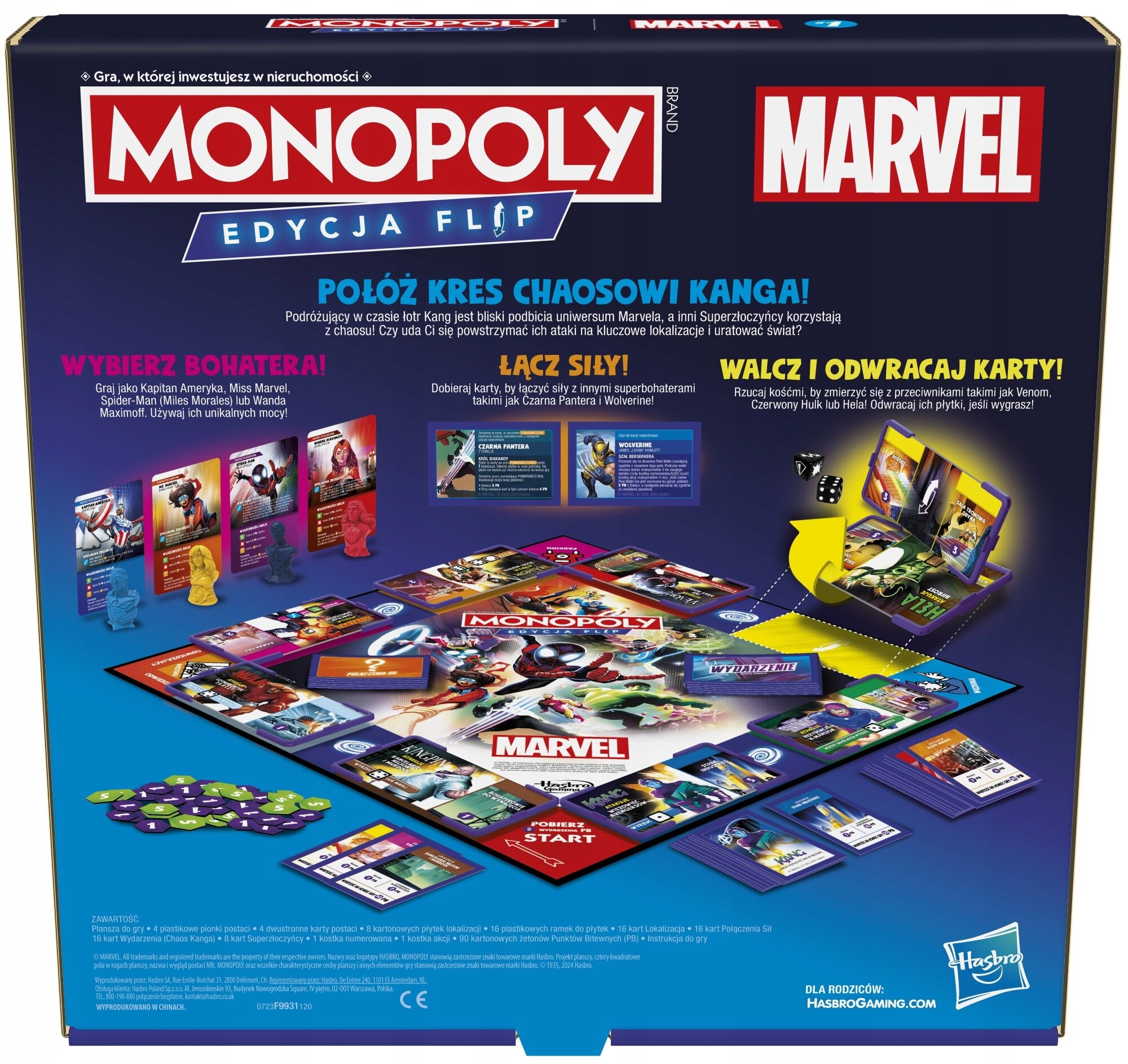 Naredite konec Kangovemu kaosu v namizni igri Monopoly Flip Edition: Marvel! Zlobnež Kang, ki potuje skozi čas, je tik pred osvojitvijo Marvelovega vesolja, drugi superzlobneži pa izkoriščajo ta kaos. Igrate kot Kapitan Amerika, gospodična Marvel, Spider-Man (Miles Morales) ali Wanda Maximoff in se morate združiti z drugimi superjunaki, da se spopadete z zlikovci, nato pa obrnete ploščice na igralni plošči in se podate na pot, da zavzamete napadene lokacije. V tej zabavni igri za otroke namesto zaslužka zbirate kartonske žetone bojnih točk z zbiranjem pristojbin za zaščito zavarovanih lokacij, združevanjem z drugimi superjunaki in še več. Ko so vse lokacije zavarovane, zmaga igralec z največ bojnimi točkami! Ta strateška namizna igra pomaga prižgati zabavo za družinski igralni večer in je odlično darilo za otroke, najstnike in vse ljubitelje namiznih iger Marvel in Monopoly. Za 2 do 4 igralce, stare 8 let in več.