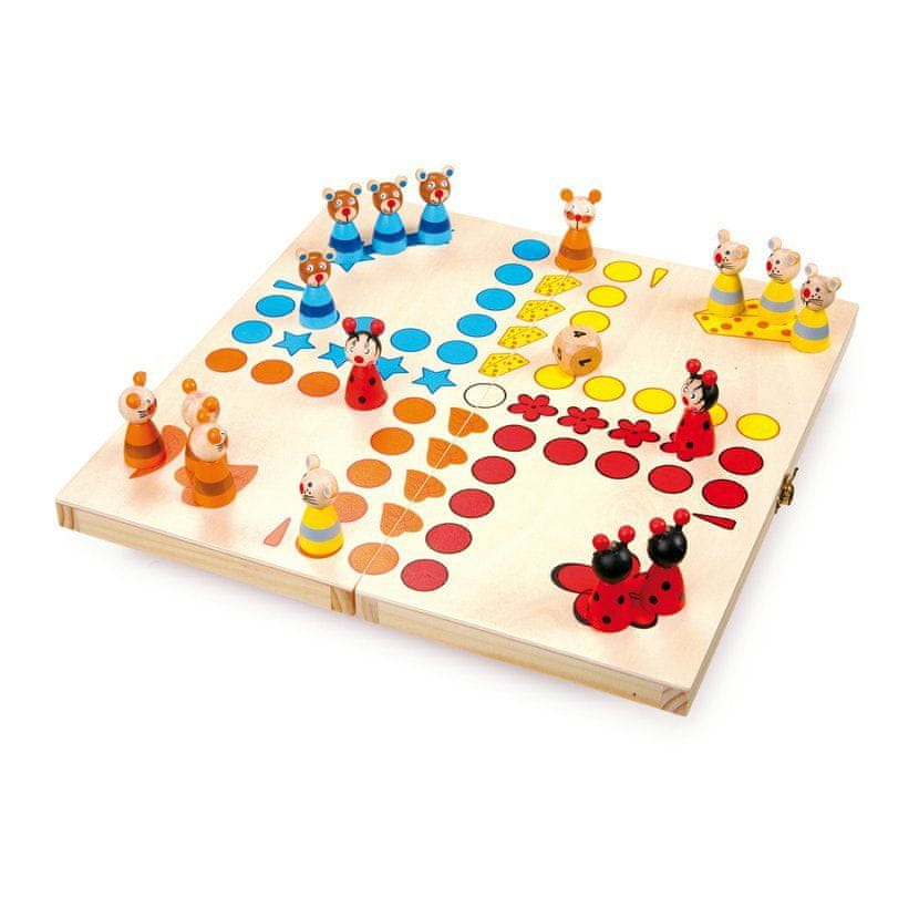Družabna igra v leseni izvedbi. Figurice živali. Primerno za otroke od 3 let. Velikost: 27 × 27 × 3 cm. Paket vsebuje igralno ploščo, lesene figure živali in kocko s številkami. Nova različica klasične igre Ne jezi se, kjer se igra s pomočjo živalskih figur. Celoten opis