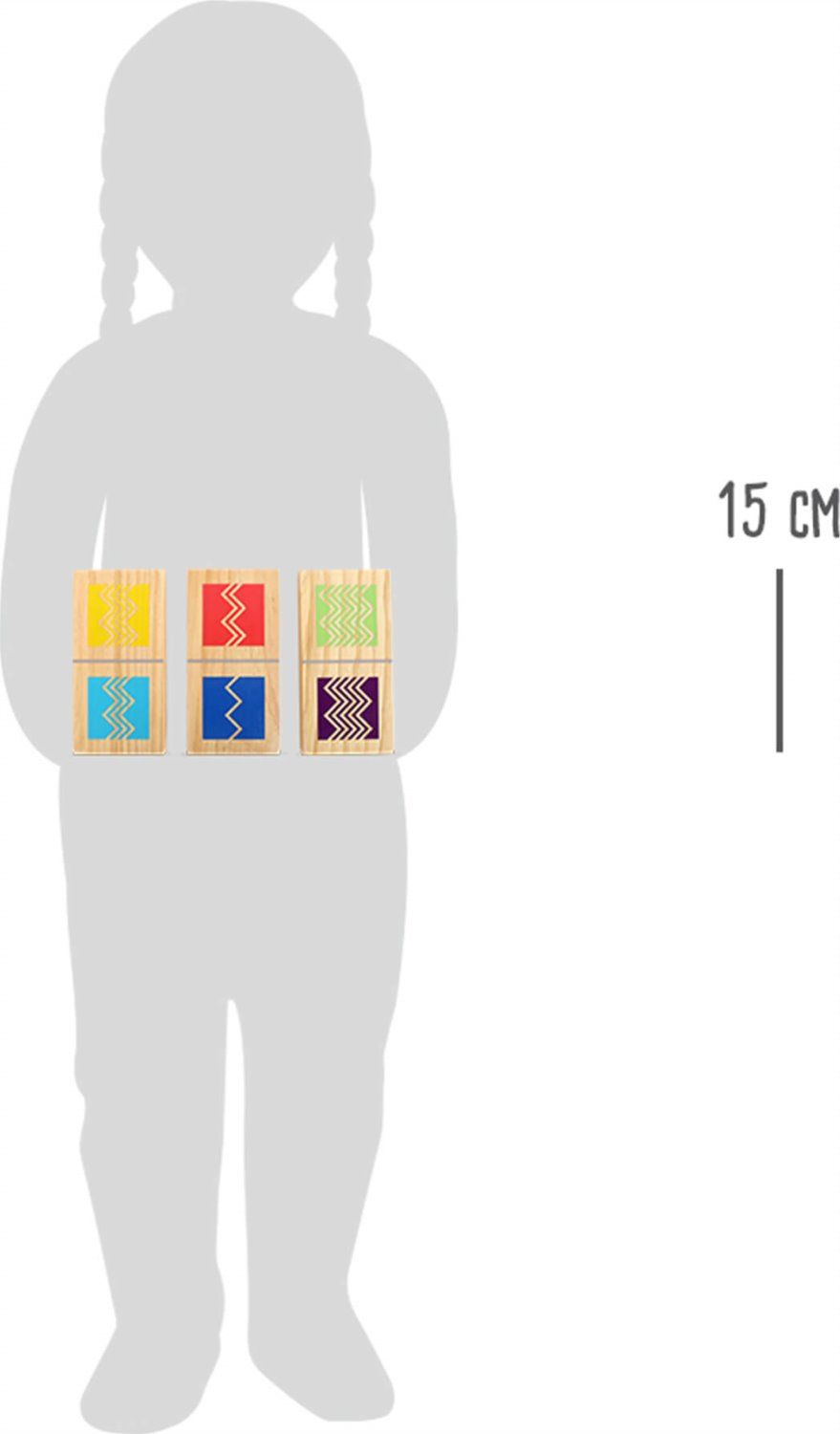Srečno se odločite za domino v velikosti XXL! Igra je izdelana iz 100-odstotno certificiranega lesa FSC in jo sestavlja 28 kosov. Barvita različica s šrafuro v povečani obliki je primerna za vse, ki želijo na igriv način vaditi svoje sposobnosti opazovanja, osnovne strategije in koncentracije. Igra se lahko igra tako doma kot na prostem in je primerna za vse starosti. Pravilo igre je, da se enaki lističi razporedijo drug poleg drugega, bodisi po barvi bodisi po šrafuri. Šrafura označuje tudi število doseženih točk. Primerno za 2 do 4 igralce. 15 × 7,5 × 1,5 cm