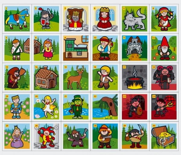 Papirnata igra spomina vsebuje 32 parov s smešnimi slikami, ki temeljijo na klasičnih pravljicah. Celoten opis