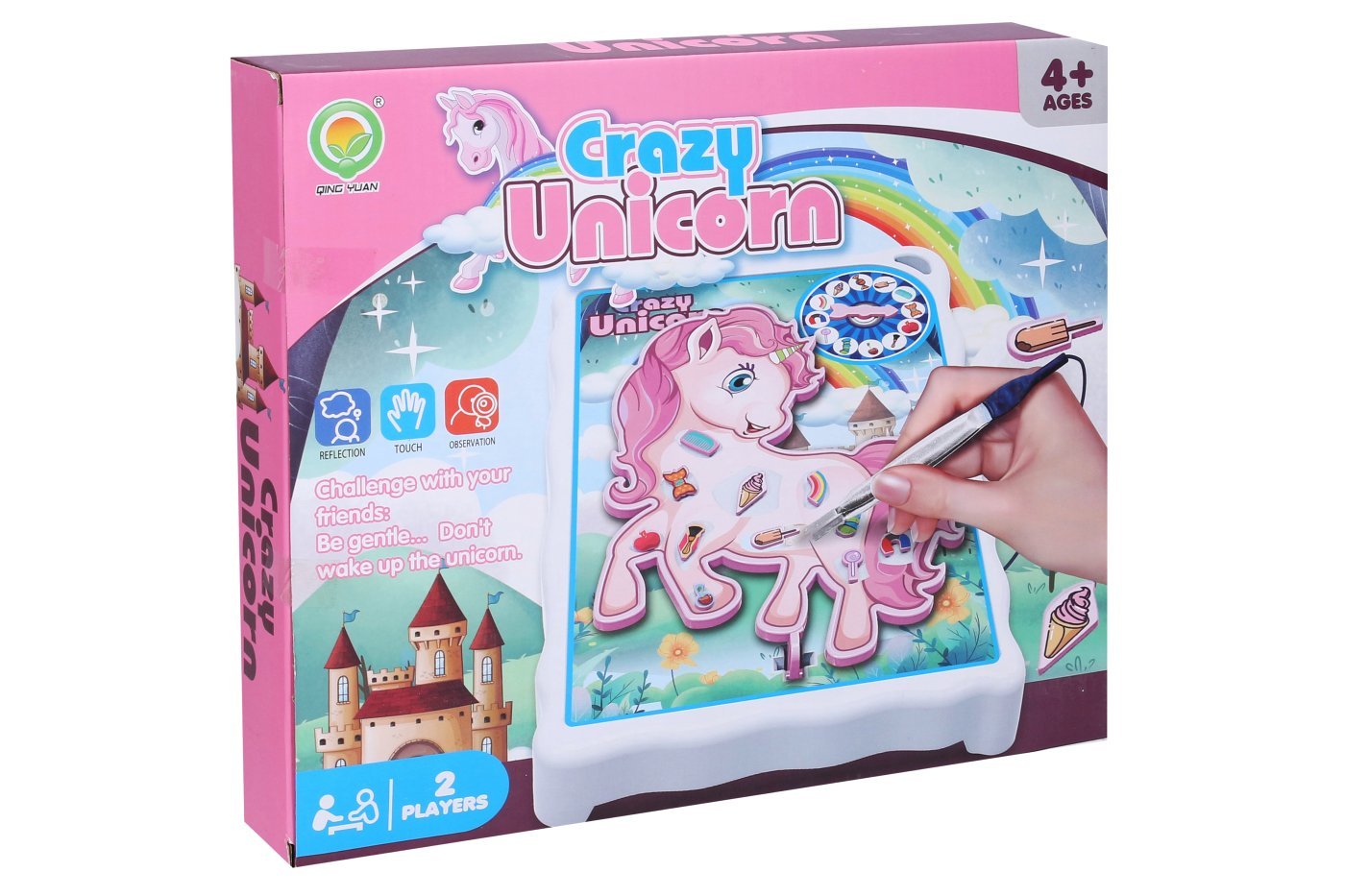 Igra z enorogi. Velikost igralne plošče je 18×3,5×15 cm. Vsebina paketa: igralna plošča s pinceto. 12 predmetov. 12 nalepk – nalepite jih na vsak predmet. Zavrtite kolo rulete in s pinceto poskusite odstraniti predmet s telesa samoroga. Ko pinceta pride v stik s površino igralne plošče, enorožec zavibrira. 1 ali 2 igralca. 3×AA ni vključena. Na dnu igralne plošče je majhen predalček za shranjevanje predmetov.