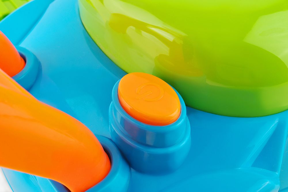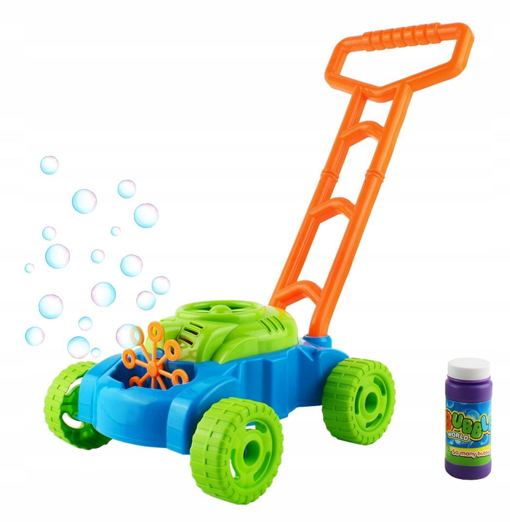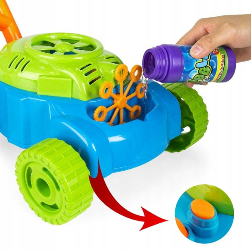 Igrača kosilnica DELAJO MEHURČKE – igrača je opremljena z 8 povezanimi obroči, ki se premikajo in potopijo v tekočino z mehurčki, majhen ventilator, ki piha tok zraka nanje, pa povzroči nastanek pisanih mehurčkov. DELAJO ZVOKE – na zadnjih kolesih so posebni plastični jezički, ki med premikanjem kosilnice dodatno ropotajo in posnemajo košnjo trave. SPECIFIKACIJA – dimenzije (širina/dolžina/višina): 26/51/49 cm, teža kompleta: 655 g, komplet vključuje kosilnico + 118 ml tekočine za mehurčke. TEKOČINA ZA MEHURČKE JE VKLJUČENA – komplet vključuje vrečko tekočine za mehurčke, ki jo preprosto nalijete v posebno posodo, ki se nahaja na sprednji strani igrače, in lahko takoj začnete igrati. PRIVLAČNE BARVE – Vsi elementi kosilnice so v živahnih, zanimivih, kontrastnih barvah, ki pritegnejo otrokovo pozornost in jih spodbujajo k igri. Ta igrača kosilnica ne bo vašega otroka le naučila skrbeti za trato, temveč bo malčke tudi razveselila in jim narisala pristne nasmehe zaradi funkcije pihanja mehurčkov. Igrača je namenjena otrokom, starim 3 leta in več. Z njo se lahko ne le vozite in se pretvarjate, da kosite trato. Mehanizem na baterije ustvarja mehurčke, ki se med vožnjo sproščajo s sprednje strani kosilnice. Komplet vključuje posodo s tekočino za mehurčke , tako da se lahko igrate takoj po sestavljanju. Mehurčki se pihajo samodejno . Majhen ventilator, ki se nahaja na vrhu ohišja motorja kosilnice, ustvarja tok zraka, ki je usmerjen na 8 vrtečih se obročev. Ti se potopijo v posodo s tekočino za mehurčke in se eden za drugim premikajo pod majhno šobo. Na ta način se mehurčki neprekinjeno pihajo. Zahvaljujoč 8 obročem igrača hkrati ustvari veliko število mehurčkov. Mehanizem se aktivira s pritiskom na gumb na ohišju kosilnice. Imitacijo motorja kosilnice zagotavlja mehanizem, ki se nahaja na zadnjih kolesih. Tanki jezički med preklapljanjem med načini oddajajo značilen ropotajoč zvok. Širok in stabilen ročaj omogoča otroku enostavno potiskanje in krmiljenje kosilnice. Igrača je večbarvna, kar še dodatno pritegne otrokovo pozornost in spodbuja aktivno igro na prostem. Sestavljanje ne zahteva posebnih veščin; preprosto potisnite posamezne dele na svoje mesto. Ta igrača kosilnica, ki piha mehurčke, je odlično darilo za vsakega otroka, njen vrtni značaj pa bo zagotovo spodbudil dejavnosti na prostem.