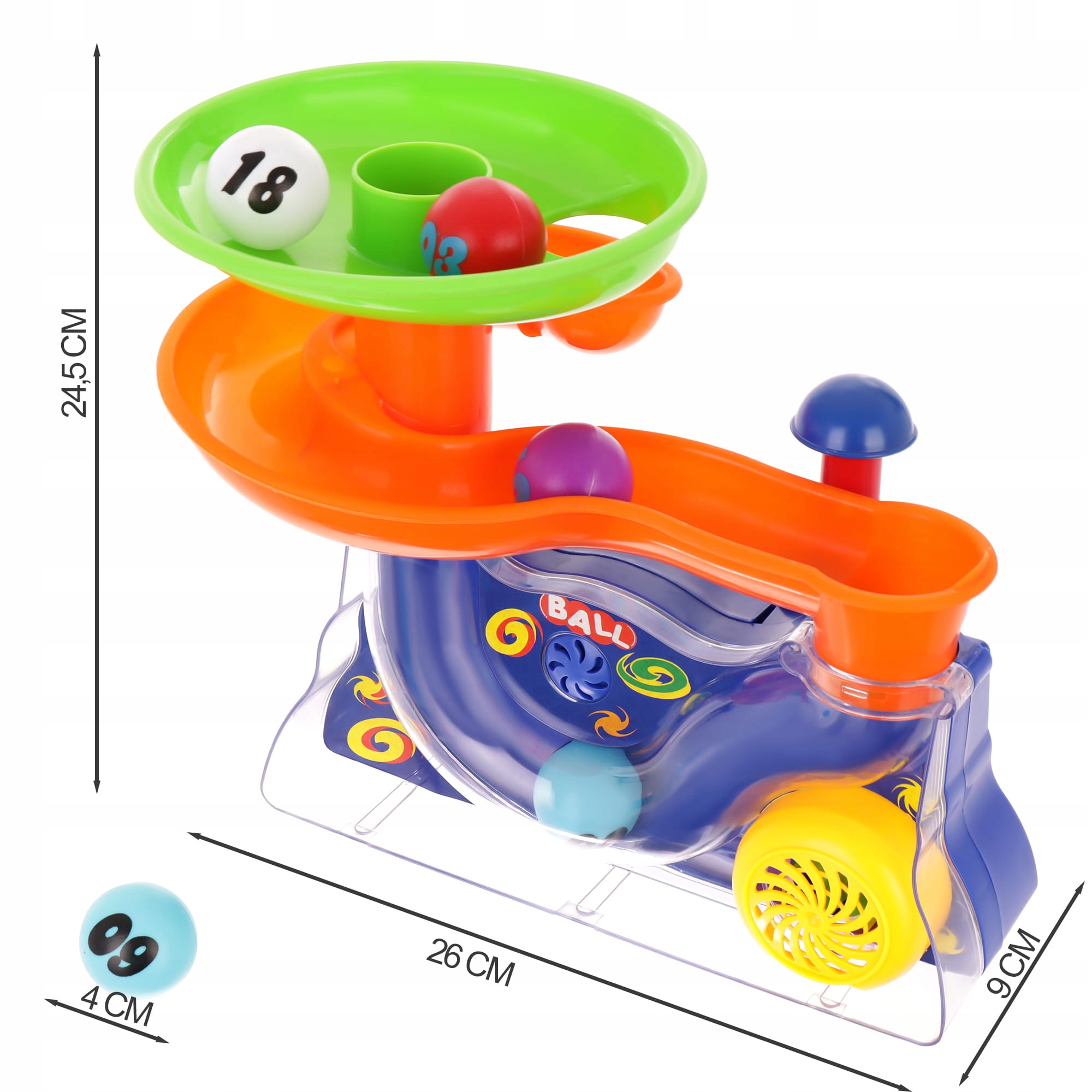 Vse, kar mora vaš malček storiti, je, da vrže žogice v izstrelilnik fontane, nato pa mora le še opazovati noro potovanje vsake od 6 žogic. Popoln je tudi za najmlajše otroke.