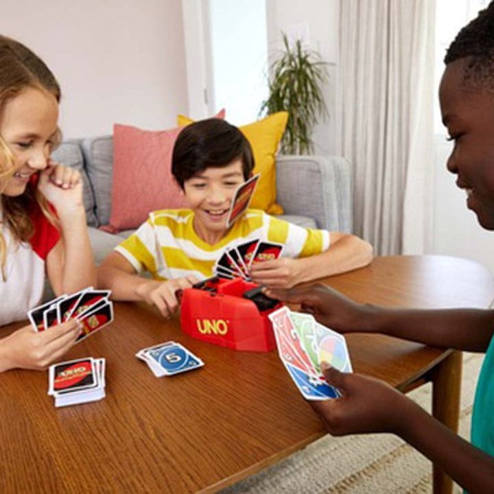 „UNO Showdown is the matching card game everyone loves but with the unexpected excitement of a card-shooting smackdown! When the lightning sounds and the UNO Showdown unit signal goes off, be the first to push down on the paddle. The quickest player wins the showdown and sends cards flying out of the UNO Showdown unit at their opponents! Players race to get rid of all their cards by matching them to the card shown on top of the deck. When players are down to one card, they must remember to yell “UNO!” Fun for kid, family or adult game night and a great gift for players.“
