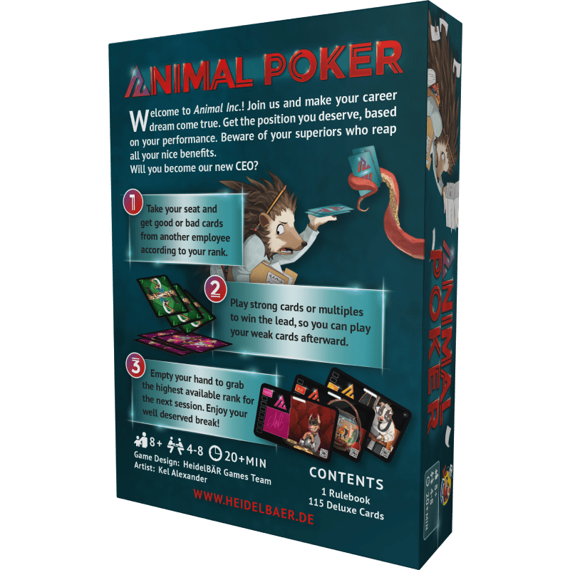 Animal Poker is the beastly good card game about the unfair life of promotion and demotion. Become the new boss in Animal Inc. from now on or stay the intern forever.“