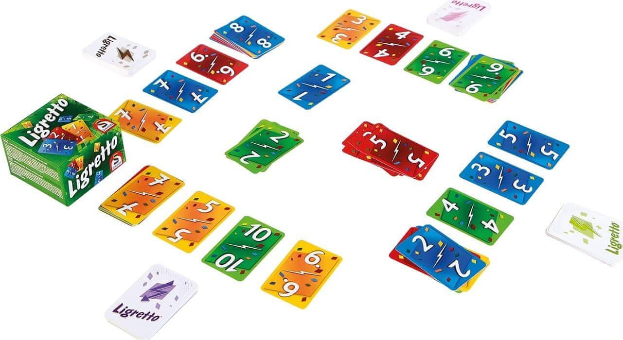 Zabavna igra s kartami, pri kateri sta ključna bistrost in hitrost. Predstavljajte si igro Ligretto z več kot štirimi igralci. Ni problema! Samo dodajte več barv. Ligretto je na voljo v treh različicah: modri, zeleni in rdeči. Če te izvedbe združite, lahko igrate z do 12 igralci. Načelo igre. 160 kart (4 kompleti po 40 kart).