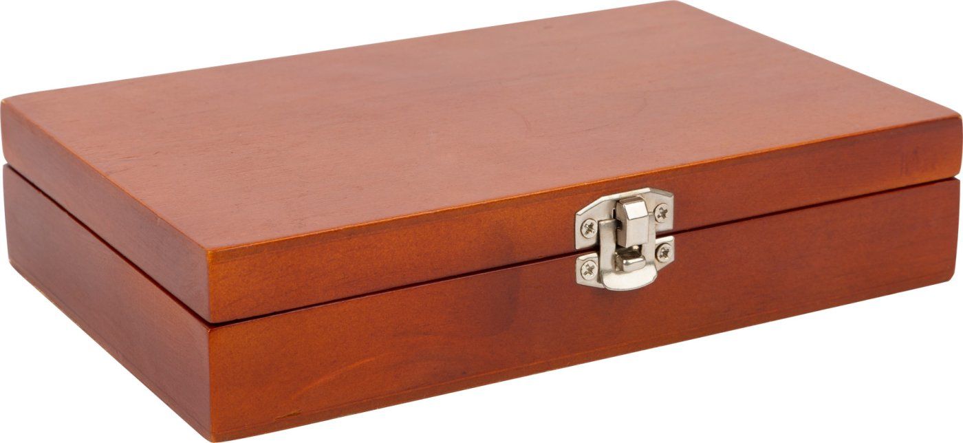 Ta visokokakovostna lesena škatla je kot majhna igralnica! V njej boste našli paket kart in 5 igralnih kock. Z dvema kupoma 54 kart lahko igrate klasične igre, kot so skat, mau mau (različica dežja) in doppelkopf (dvojna glava). Del škatle ima zeleno krpo, ki je kot nalašč za metanje kock. Škatlo je mogoče varno zapreti s ključavnico, zato je igra idealna za potovanja . Glavneznačilnosti: praktično zaklenljiva škatlaprimerna za potovanjaigra lahko skate, mau mau (dežna različica) in doppelkopf (dvojna glava)vsebuje 5 kock