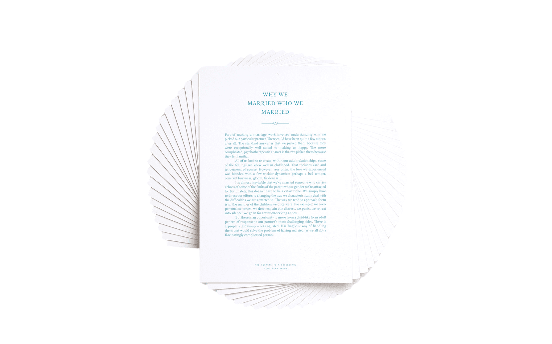 This box is The School of Life’s guide to the rest of a life together, containing twenty beautiful cards which lay out the central ideas on how to make a relationship work over the decades beyond the wedding day. It is filled with artful suggestions on coping with what even the most loving couple will face as they build a life together. This set of cards is both a celebration of marriage and a rich source of insights into the skills it demands.