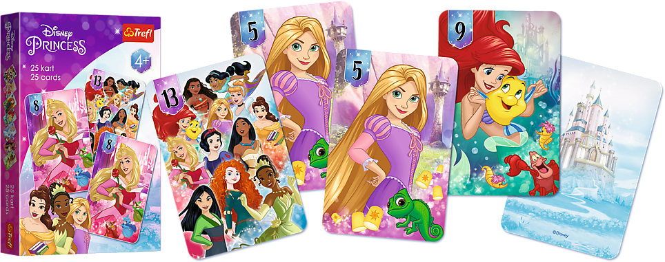 Kdo se znebi vseh svojih kart z enako oznako in komu na koncu igre ostane Črni Peter? Skozi igro vas bodo spremljale Disneyjeve princese. Karte: 25 kart – 12 parov z enako številko + 1 Črni Peter Velikost škatle: 6 × 9 cm Primerno za otroke od 4. leta starosti