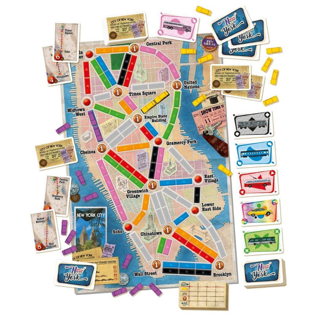 Ticket to Ride je sodobna klasika družabnih iger. Igralci se odpravijo v dir za destinacijami. Cilj Ticket to Ride New York je vzpostavljati taksi povezave med različnimi destinacijami in znamenitostmi New Yorka.