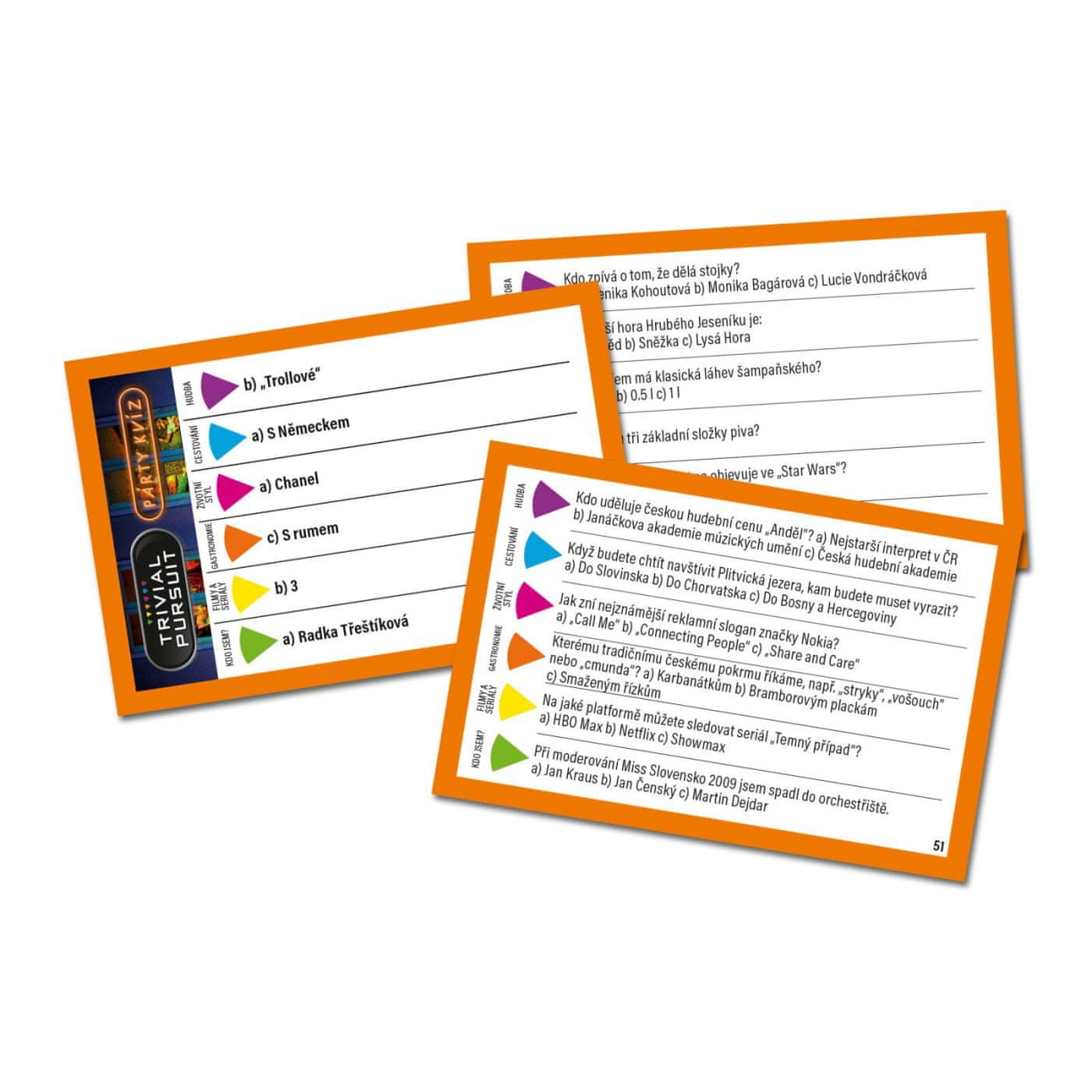 Priljubljena igra znanja Trivial Pursuit v zabavni različici „Party“. Vključuje preprostejša pravila, hitrejše igranje in nove možnosti igre, ki povečajo dinamiko in napetost. Igralci odgovarjajo na vprašanja na različnih področjih in poskušajo čim hitreje dobiti barvne kline. Odlična za družinske večere in druženja s prijatelji. Vključuje češka pravila.