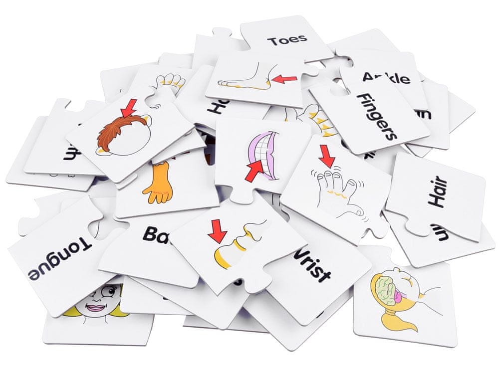 Najdi in ujemaj dele sestavljanke v angleščini je popolna sestavljanka za vsakega otroka. Odlično združuje učenje in zabavo. Otrok mora pravilno sliko povezati z imenom. Deli telesa k besediówka v angleščini. Ta komplet oblikuje otroka v smislu učenja, logičnega razmišljanja, pomagal mu bo pri spoznavanju delov človeškega telesa in osvajanju angleškega jezika.