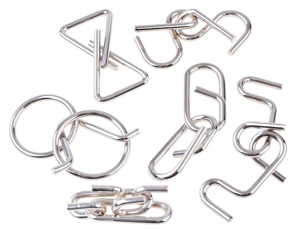 Kovinska sestavljanka igra, v kateri je cilj odklopiti in ponovno povezati dva dela brez uporabe sile Celoten opis
