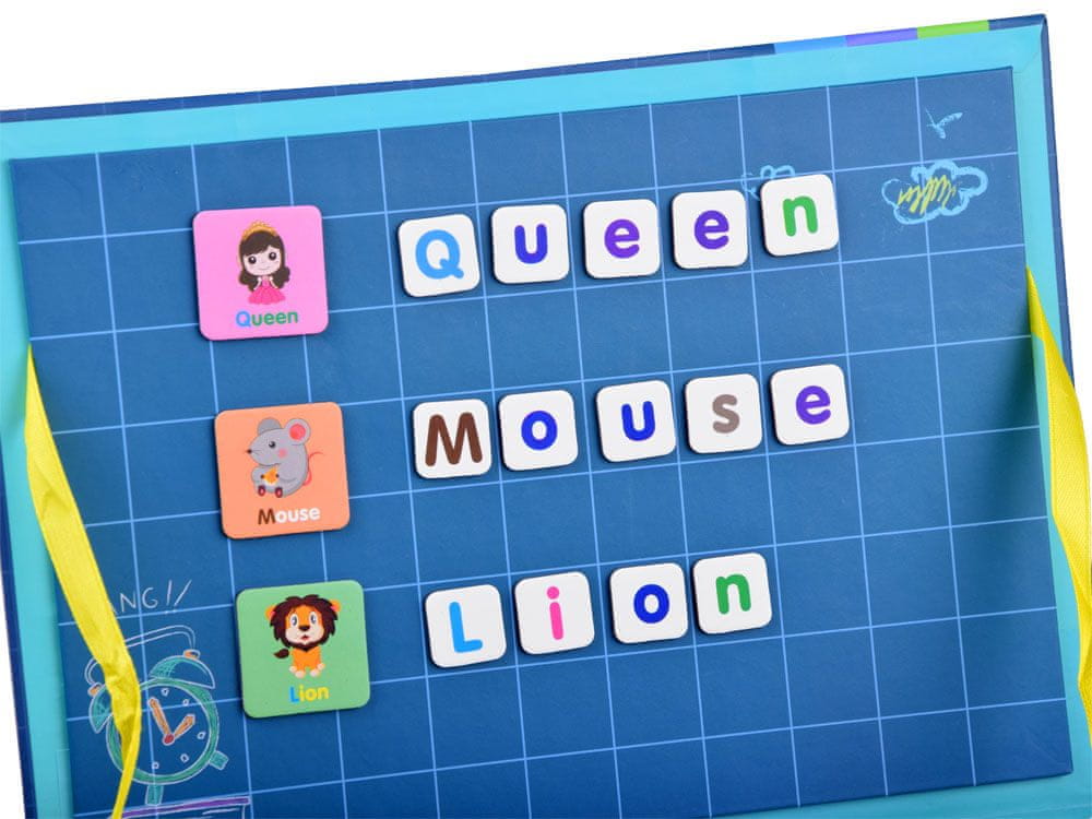 Abeceda Učenje črk, besedóbesed od najzgodnejših let je vedno dobro. Komplet sestavlja do 134 elementov, ki vključujejo majhne in velike črke, slike z imeni v angleščini in slike z barvami. Celoten komplet magnetne abecede je zaprt v trdo platnico, ki posnema knjigo. Ko odprete črke, lahko slike nalepite na magnetno tablo.