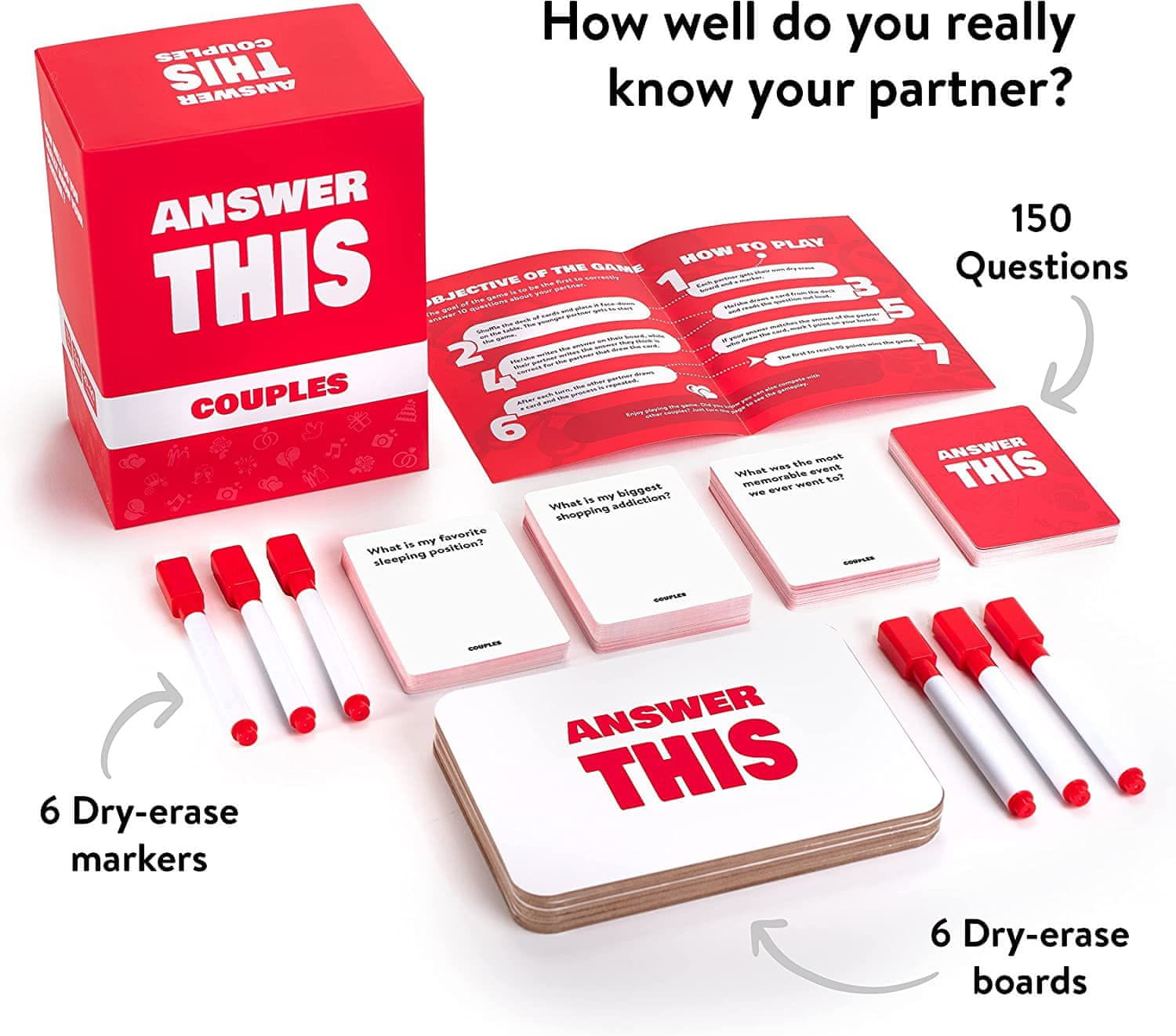 V škatli boste našli 150 kartic z vprašanji za pare, vse od preprostih do globljih vprašanj. 6 plošč za suho brisanje in 6 markerjev za suho brisanje. To pomeni, da lahko to igro igrajo do 3 pari hkrati.