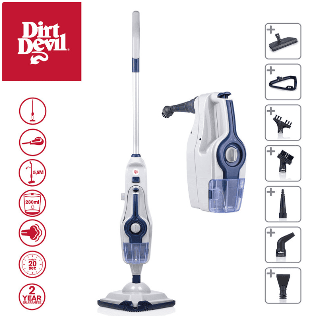 Parnemu čistilniku Dirt Devil je poleg krtače za tla in krtače za preproge priloženo 5 nastavkov: majhna ukrivljena šoba, šoba s točkovnim curkom, šoba s tankim curkom in 2× krtačna šoba. To vam omogoča, da s paro higiensko očistite ne samo tla, temveč tudi ogledala, umivalnike in celo platišča vašega avtomobila. Za uporabo parnega čistilnika je dovolj, da v rezervoar za vodo dodate 280 mililitrov vode, poleg tega ima parni čistilnik tudi posodo za detergent s prostorom za 150 ml detergenta.