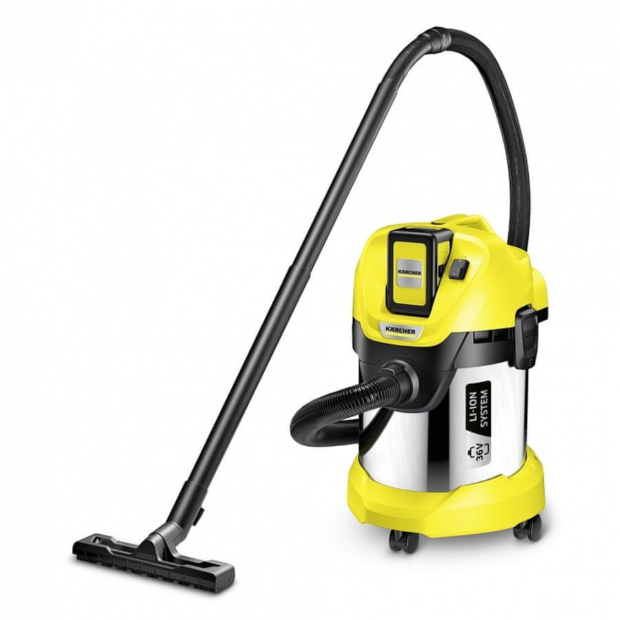 • Karcher večnamenski akumulatorski sesalnik WD 3 Premium Set je visokokakovosten, učinkovit in izredno priročen pomočnik pri čiščenju, primeren tako za sesanje suhe kot mokre umazanije.