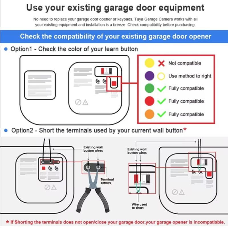 Namestitev te kamere je hitra in preprosta. Samo pritrdite jo na motor garažnih vrat, vstavite pomnilniško kartico micro SD ter jo povežite z električno energijo in omrežjem Wi-Fi . Nato prek Google play ali App Store prenesite aplikacijo „Tuya Smart“ ali "Smart Life “ na svoj telefon in sledite navodilom za seznanitev kamere z aplikacijo. Z mobilno aplikacijo Tuya Smart Home lahko z eno samo aplikacijo upravljate tako kamero kot garažna vrata od koder koli na svetu. Hkrati lahko kamera v obliki alarma/obvestila prek mobilne aplikacije pošlje opozorilo na vaš mobilni telefon.