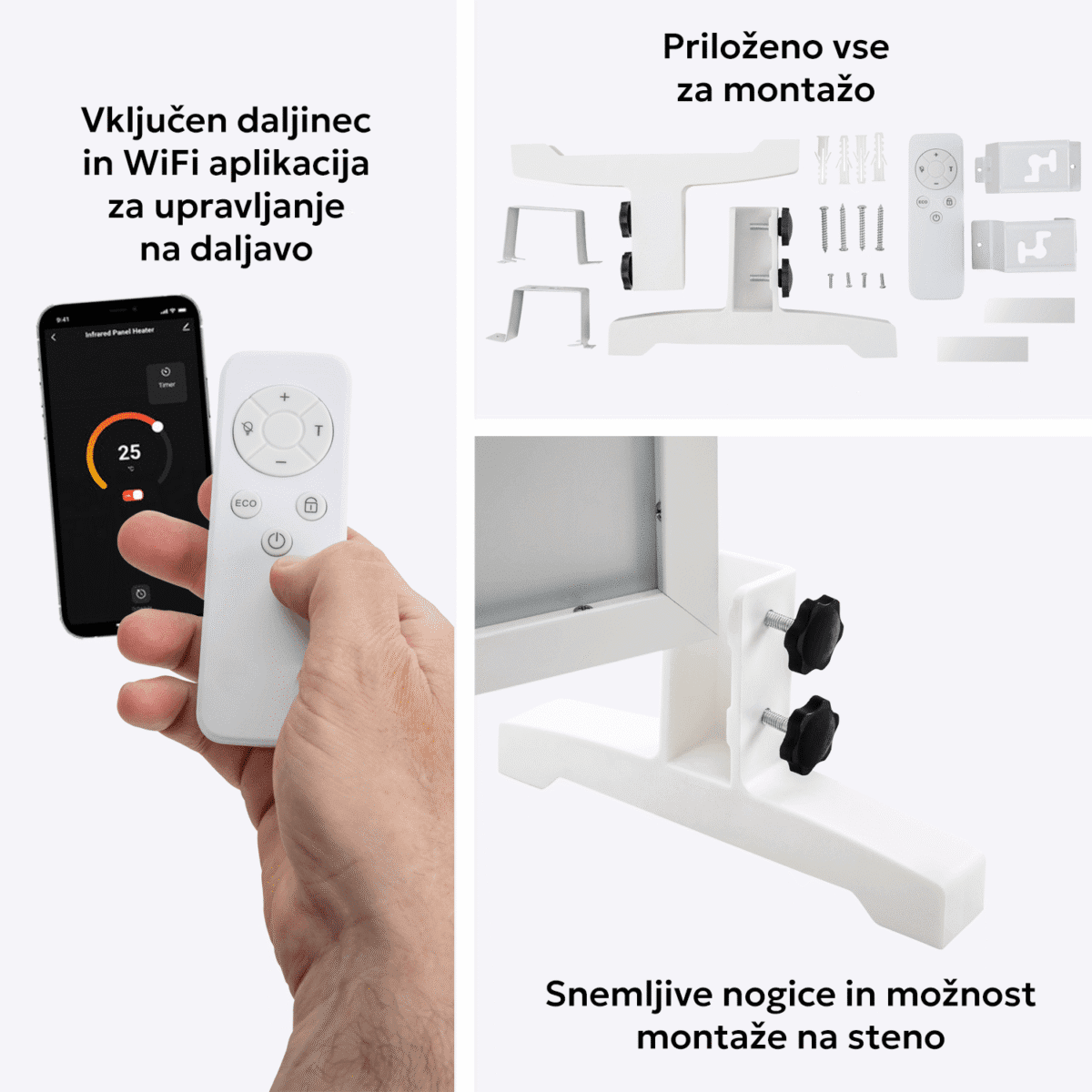 Zahvaljujoč samostoječemu podstavku lahko Move Smart enostavno postaviš kjerkoli – v dnevno sobo, pisarno, počitniško hišo ali delavnico. Upravljanje je preprosto preko vgrajenega termostata in daljinskega upravljalnika, možnost WiFi povezave pa omogoča pametno regulacijo preko aplikacije.