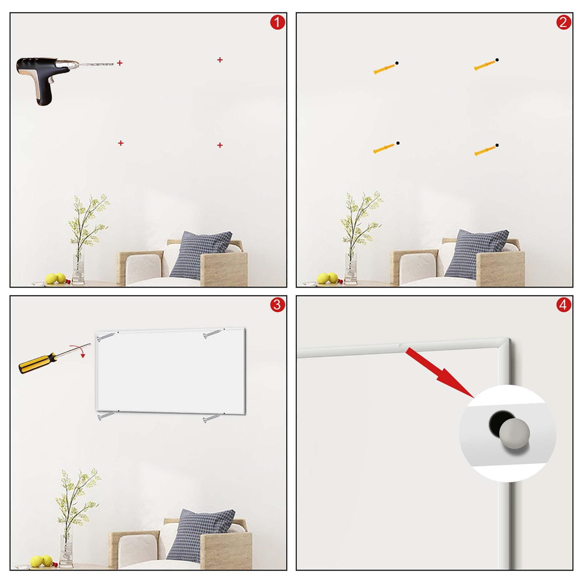 Montaža SLIM IR infrardeče panel grelne plošče je preprosta in jo lahko opravite sami. V kompletu prejmete vse potrebne pritrdilne elemente in navodila za montažo. Ploščo enostavno pritrdite na steno s priloženimi vijaki in distančniki. Priporočamo, da ploščo namestite na sredino prostora, da dosežete optimalno ogrevanje.