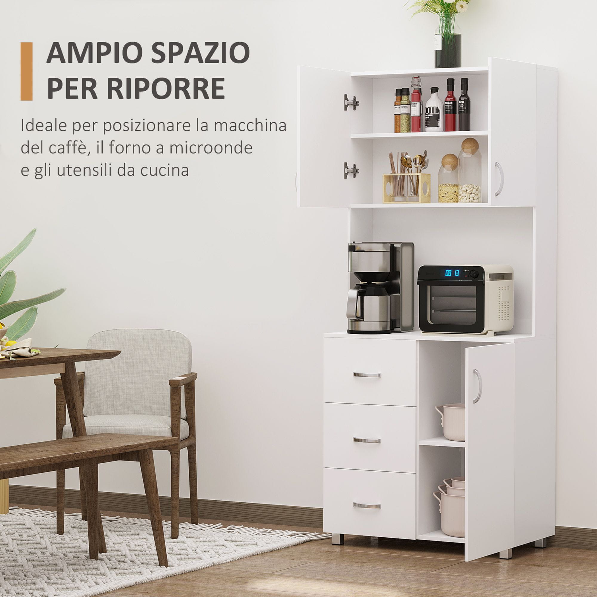 Klasika: Zahvaljujoč površinam, prebarvanimi v belih in kovinskih ročajih, ima to prepričanje klasičen, a brezčasen videz. Prostorno: v notranjosti imate 2 omarici (s 3 nastavljivimi policami) odprte police in 3 predale. Ves prostor, ki ga potrebujete za urejanje očal, jedi, pladnjev in jedilnega pribora in imate tako urejeno kuhinjo, ki ste jo vedno želeli! Robustna in varna: Zgrajena s ploščami na plošči, je robustna in lahko podpira do 80 kg teže. Z dogovorom proti ponovnemu precesiranju, da bi prepričanje odpravili na steno, je varna. Vsestransko: prepričanje je kot nalašč za kuhinjo, jedilnico ali za trgovine, kot so slaščičarne, pekarne in bari. Velikost: Splošna velikost: 80L x 39,5p x 183,5acm. Zmogljivost teže: 80kg (skupaj), 5kg (polica), 5kg (predal). Ali želite opremiti svoj dom in vedno hraniti posodo, očala in lončke? To prepričanje Homcom združuje eleganco in funkcionalnost in je kot nalašč za okrasitev vaše jedilnice ali kuhinje