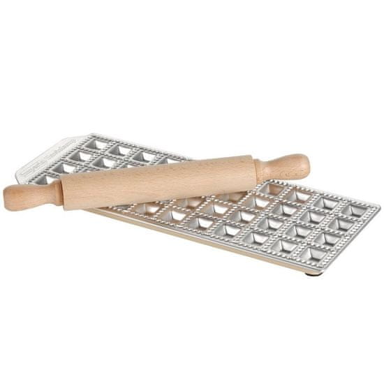 IMPERIA MODEL ZA KLASIČNE RAVIOLE Z VALJARJEM 44 RAVIOLINI iz linije RAVIOLAMP je izdelan iz aluminija in je odličen pripomoček za pripravo tradicionalnih italijanskih polnjenih testenin – raviolov. S kalupom s kvadratnimi oblikami boste pripravili 44 raviolov, 25 × 25 mm. Za dobro stabilnost in zaščito občutljivih površin je kalup na spodnji strani opremljen z gumijastimi nogicami. Navodila: kalup za raviole pomokajte in ga pokrijte s sveže pripravljenim listom testenin, ki ga na tanko zvaljate z valjarjem ali pa s strojčkom za testenine. Testo nežno potisnite v odprtine in jih napolnite s polnilom po vaši izbiri. Robove rahlo namažite z rumenjakom ali vodo in nanje položite drugi list testenin. S pomočjo malega priloženega valjarja iz bukovega lesa stisnite obe plasti skupaj. Z rahlim pritiskom odstranite odvečen zrak in razrežite posamezne raviole. Ko boste kalup obrnili bodo ravioli padli iz njega. Preglejte vsak raviol in se prepričajte, da je ob robovih dobro zaprt. Položite jih na pomokan krožnik. Uživajte v pripravi okusnih domačih raviolov.
