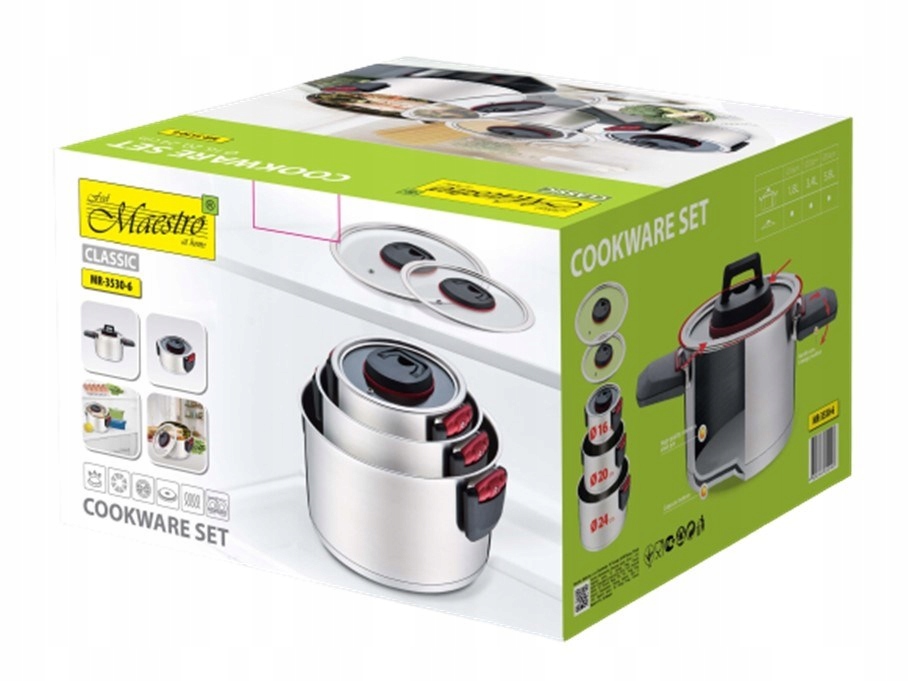 Komplet posode Maestro MR-3530–6 deluje dobro na vseh vrstah kuhalnih plošč (od plinskih do indukcijskih) in bo zagotovo izboljšal vaše kuharske sposobnosti.