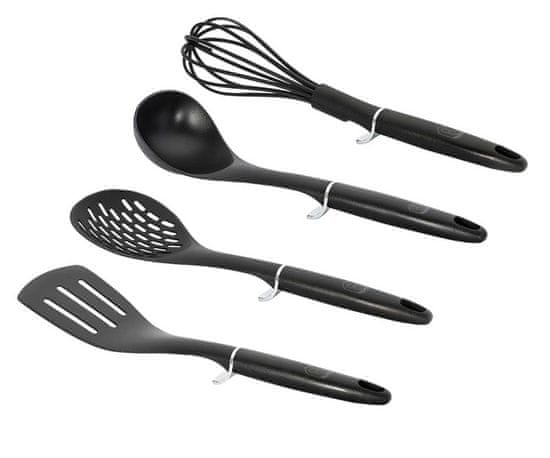 4-delni komplet kuhinjskih pripomočkov iz najlona iz linije Black Silver znamke BERLINGER HAUS. Ti pripomočki so še posebej priporočljivi za posodo s keramično in teflonsko prevleko. Material, iz katerega so izdelani, ne opraska posode. Odporen je na vročino do 210 stopinj Celzija in ima posebne antibakterijske lastnosti.