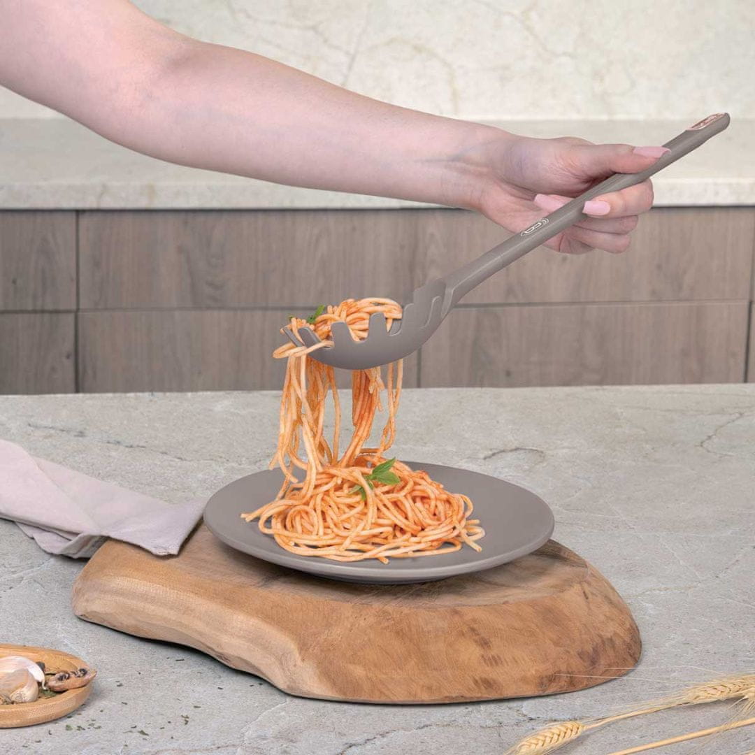 Zaradi ergonomske oblike ročajev se pripomočki v roki varno in udobno držijo. Visokokakovosten material, iz katerega je izdelan jedilni pribor, je odporen na visoke temperature. Pripomočki ne opraskajo površin posode.
