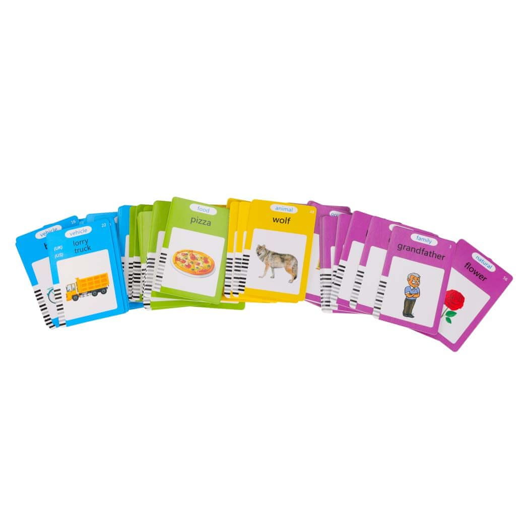Različne tematske kartice omogočajo sistematično učenje in razširitev besedišča že v zgodnjih letih.