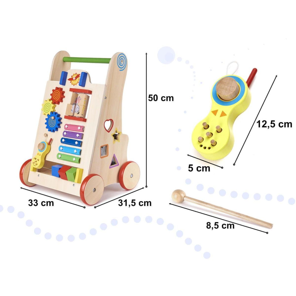 Hodite, igrajte se in se učite! Lesena večnamenska hojica ponuja številne zahtevne dejavnosti v podporo razvoju motoričnih sposobnosti vašega otroka. S svojo uravnoteženo zasnovo je otroška hojica dober pripomoček za otroke od 12. meseca dalje, ki so pripravljeni narediti prve korake. Pripravite se na veselje, ko vas vaš malček prehiti po hiši.