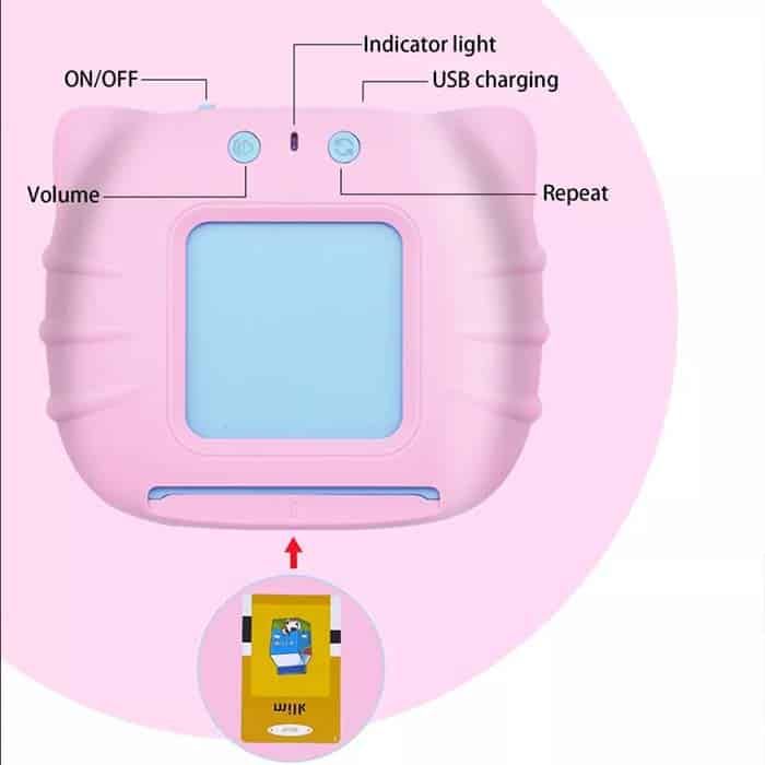 • Uporaba: Napravo napajate preko priloženega USB kabla. Rdeča lučka pomeni, da se naprava polni, modra, da naprava deluje, zelena pa da je zaznala kartico, ki ste jo vstavili. Igračo prižgete na stikalu, ki se nahaja na spodnjem delu igrače. Če stikalo premaknete na ON se bo prižgala, na OFF pa se bo ugasnila. Ko je naprava prižgana, vanjo vstavite kartico in igrača bo zaznala kartico ter izgovorila ime predmeta/živali/hrane ipd., ki je narisan na sliki. Tako se otrok nauči izgovorjave ter hkrati pravilno angleško izgovorjavo poveže s sliko na kartici. Na gumbu za zvok lahko prilagajate glasnost zvoka. Na gumbu z zaokroženimi puščicami pa igrača ponovno izgovori besedo.