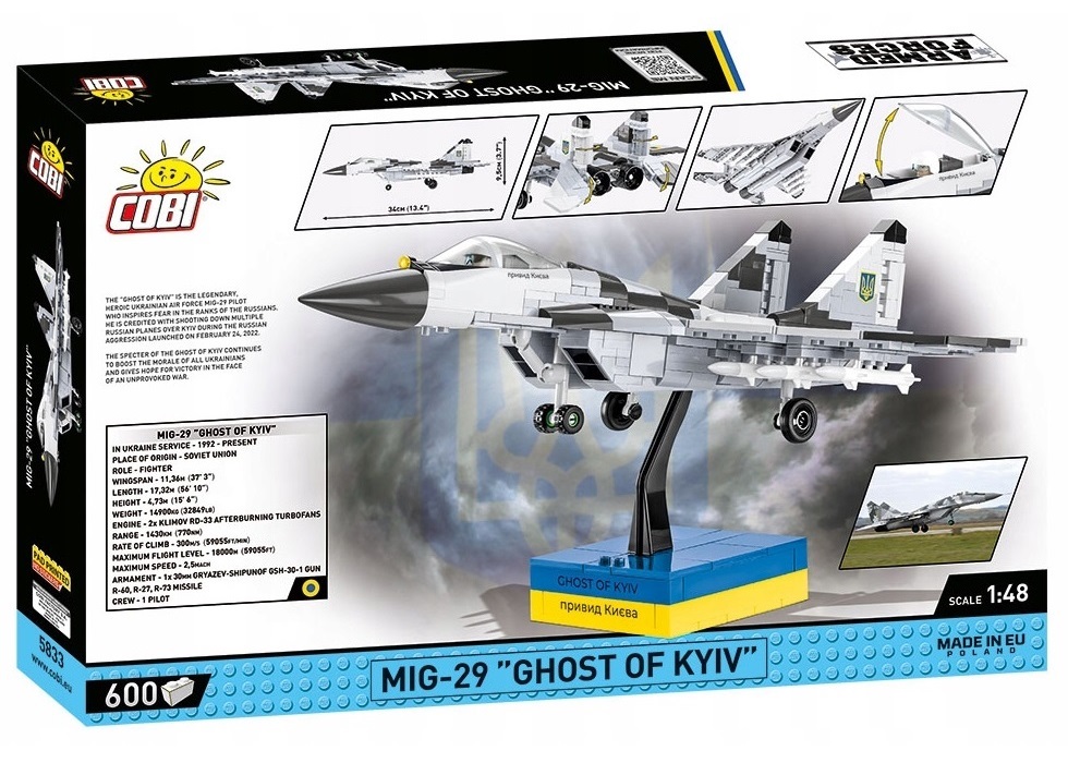Ta model MIG-29 v ukrajinskih barvah je bil zasnovan v merilu 1:48 in je sestavljen iz 600 visokokakovostnih delov. Vse oznake in napisi na modelu so natisnjeni in se z uporabo ne bodo obrabili. Komplet vsebuje premične elemente, kot so kolesa in krilca, ter odpirajočo se pilotsko kabino, v katero lahko postavite poenostavljeno figuro pilota, ki jo sestavljajo čelada, glava in mikro telo. Komplet vključuje razstavno podlago v ukrajinskih barvah. Podstavek vključuje poseben prostor, pripravljen za figuro pilota „Spirit of Kiev“ v omejeni izdaji, ki smo jo izdali kot ločen izdelek.