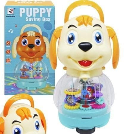 Interaktivni pasji hranilnik je edinstvena igrača, ki združuje številne zabavne in izobraževalne funkcije. Ima pisane lučke, predvaja glasbo in vesele melodije, se vrti za 360 stopinj in se lahko premika. Ima tudi ročaj za nošenje za enostavno igro in prenašanje. Posebna reža za denar na pasji glavi spodbuja otroke, da se učijo varčevanja denarja. Pasjo glavo je mogoče odviti, da poberete prihranke, gibanje pisanih zobnikov v krogli pa doda estetski pridih, čar in vizualno privlačnost. Ta edinstveni hranilnik otrokom ne nudi le zabave, temveč jih tudi uči vrednosti varčevanja ter razvija njihove fine motorične in zaznavne sposobnosti.