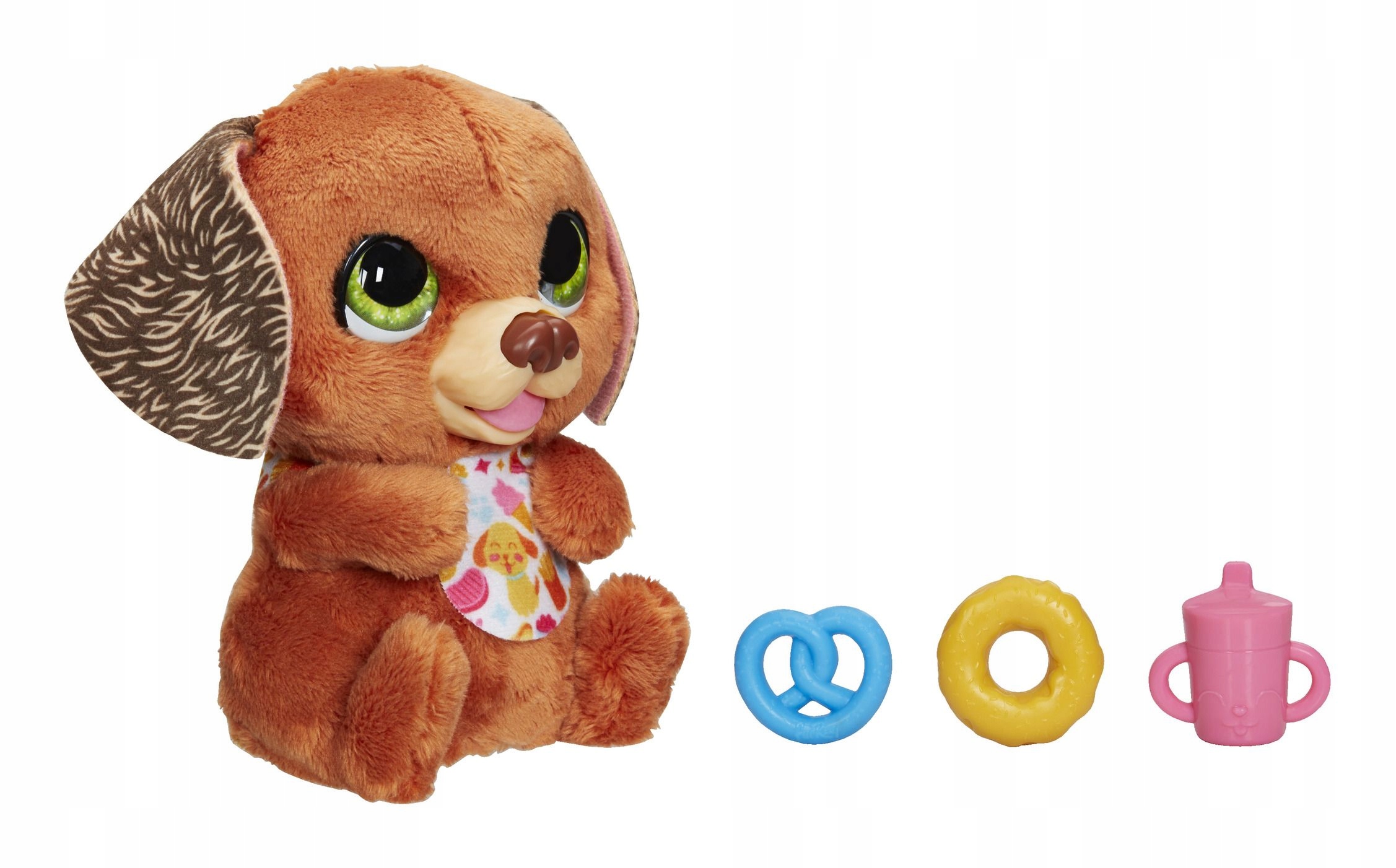 • Kužek FurReal Newborns je mehak in prikupen dojenček, za katerega je treba skrbeti in ga hraniti. Psu so priloženi skodelica za pitje, prestica, mini krof in čudovit slinček.