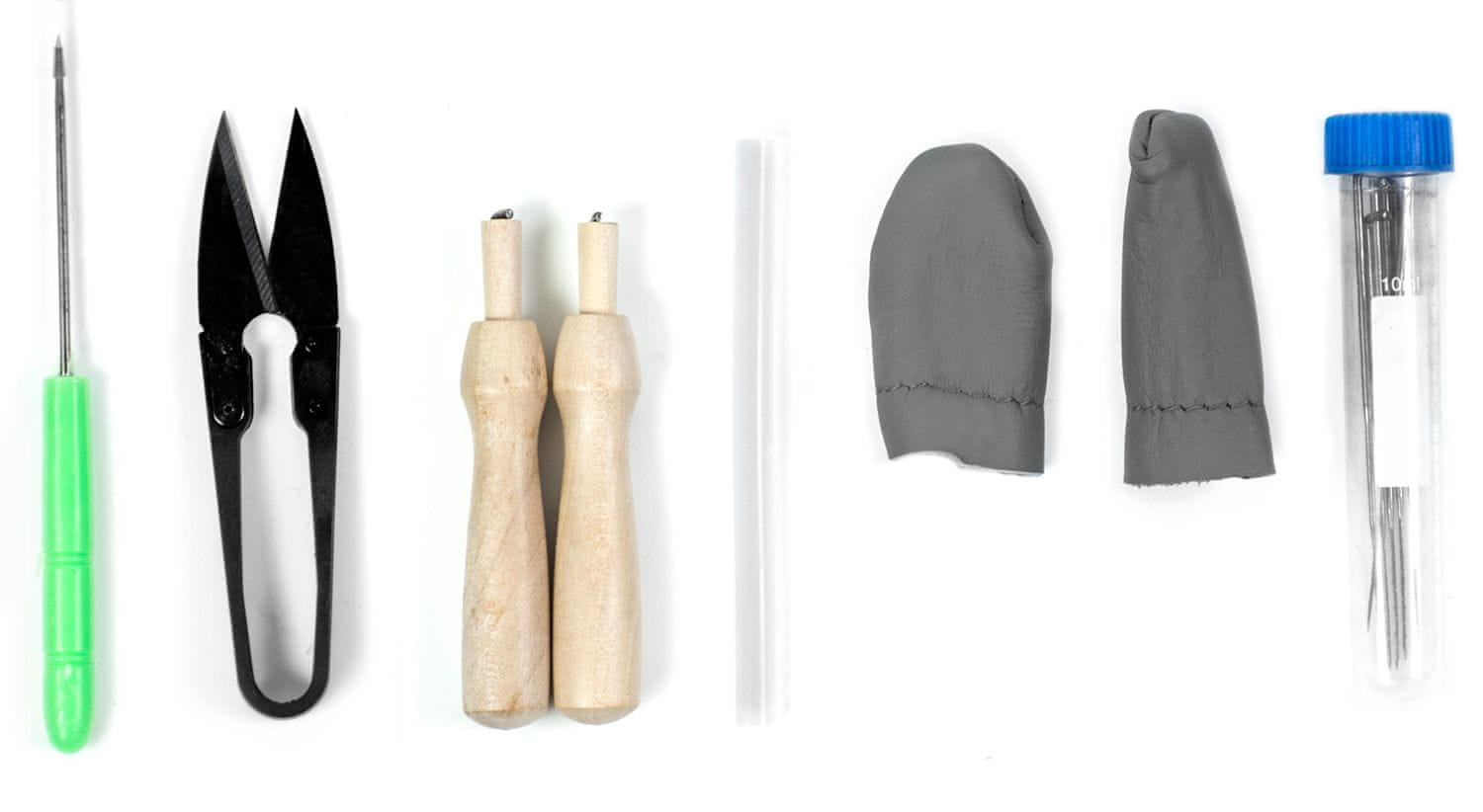 orodja: 6 igel, penasta podloga, škarje, 2 leseni ročaji, 2 rokavici za naprstnik, šilo, 1 vroče lepilo ❗ Zaradi ostrega orodja naj otroci komplet uporabljajo pod nadzorom odrasle osebe.