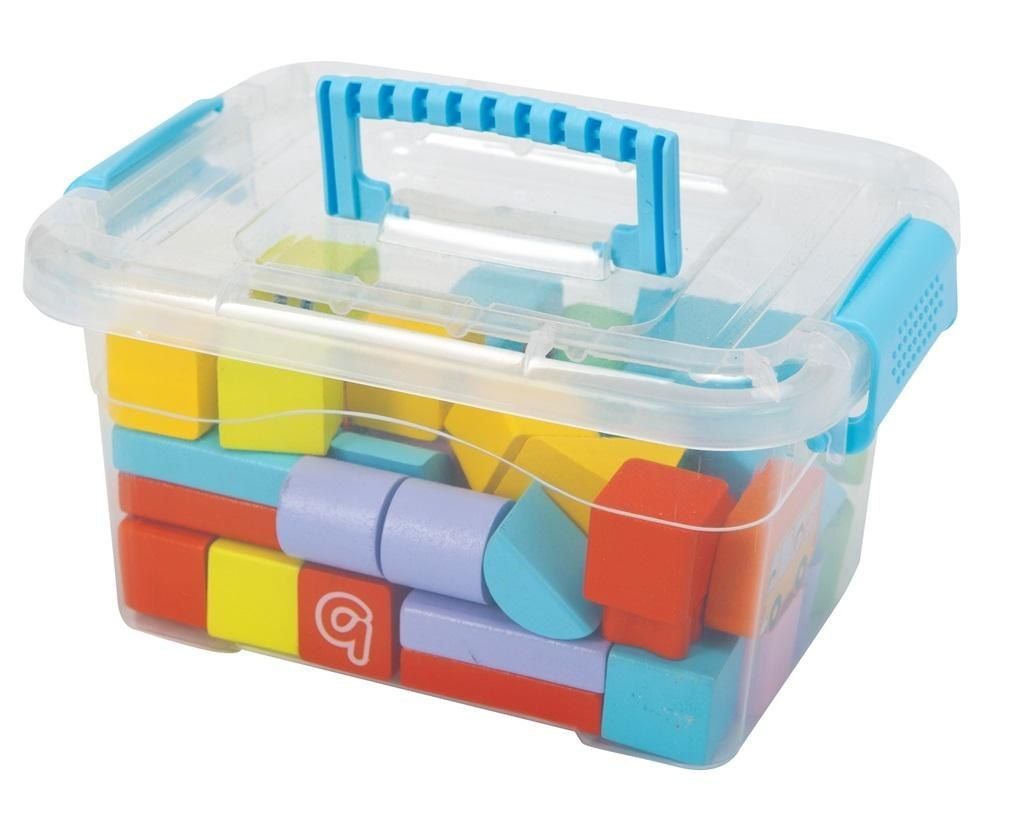 Komplet 76 pisanih kock, pakiranih v plastični posodi z ročajem. Zahvaljujoč raznolikosti oblik lahko z kockami sestavite nešteto struktur. Komplet vsebuje navodila z vzorci.