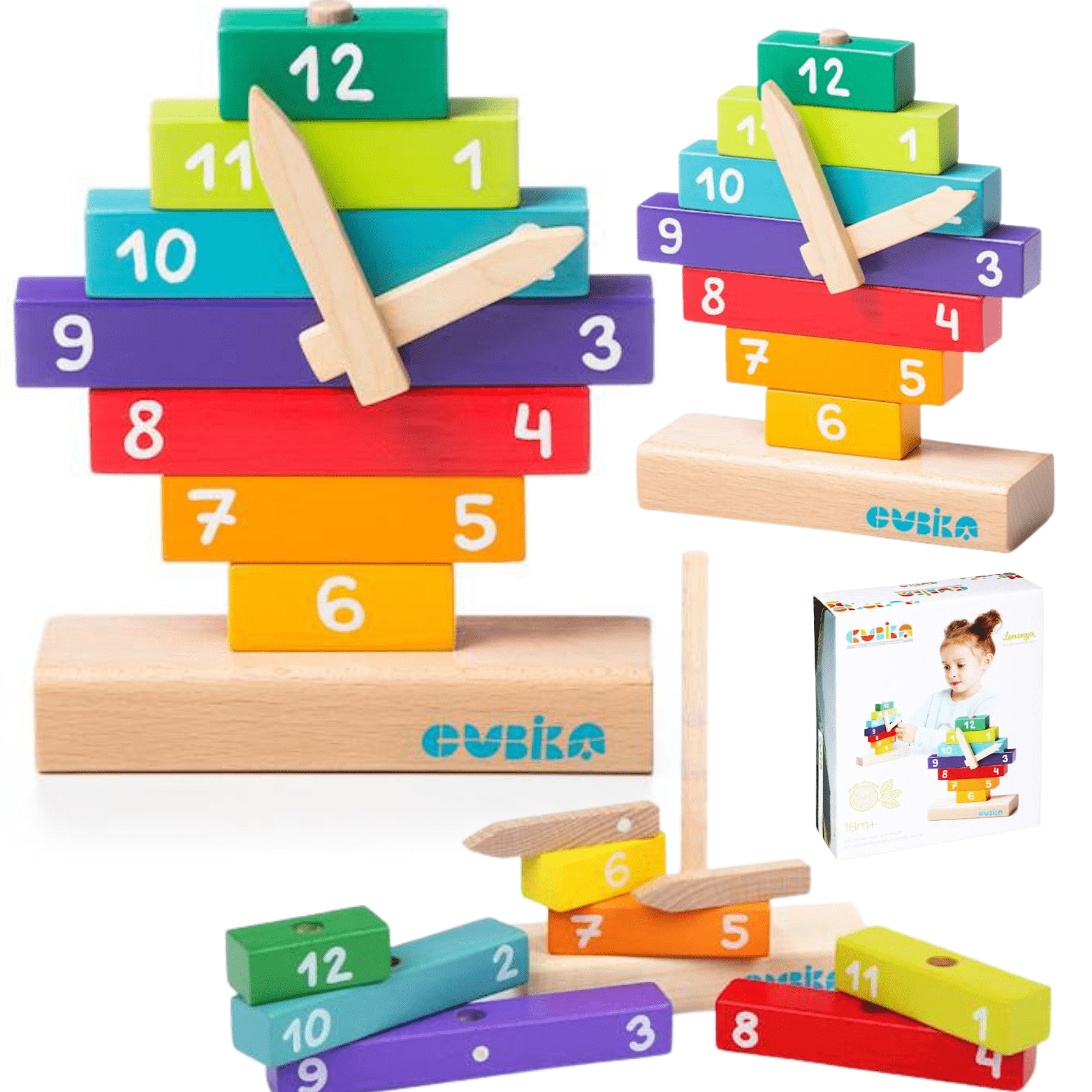 Sestavljen je iz lesene podlage, na katero je mogoče postaviti kocke . Vsak blok je vgraviran s številkami kar otrokom omogoča, da se učijo številk in njihovega vrstnega reda na številčnici ure. Ko pravilno razporedite bloke, lahko na koncu dodate kazalce in končali ste!