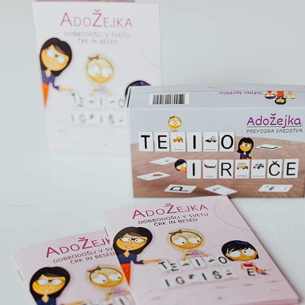 Igra z AdoŽejko je popolna zabava za celo družino! AdoŽejka je luštni didaktični pripomoček, s katerim spoznavamo in odkrivamo neskončno vesolje črk in besed ter se naučimo črke povezovati s pojmi in predmeti, ki se začnejo na določeno črko.