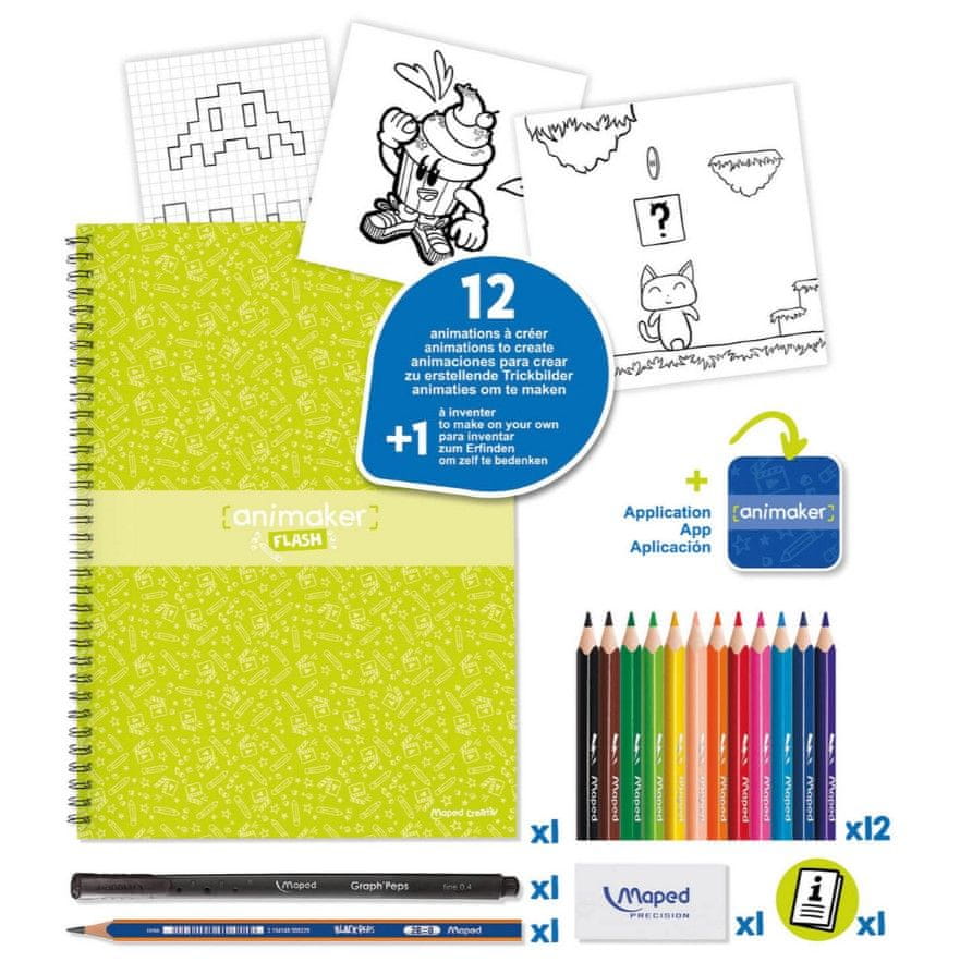 Animaker Flash s pop temami Maped Creativ ponuja komplet Animaker Flash, ki vam v kombinaciji z brezplačno aplikacijo omogoča nalaganje 12 mini risanih zgodb za postavitev oblikovane predloge ali v skladu z vašim neomejenim konceptom. Otroci predloge pobarvajo ali pa si izmislijo svoje zgodbe tako, da jih zapišejo v pripravljena prazna polja. Risbe lahko preprosto spremenite v prave animirane zgodbe. Vse kar morate storiti je, da v posebej ustvarjeni brezplačni aplikaciji fotografirate 12 barvne grafike na dveh sosednjih straneh zvezka in končali ste. Zabava vas uči osnov stop-motion animacije, kar vam omogoča razumevanje procesa ustvarjanja filma. Najprej pobarvate grafiko, kjer se položaj predmetov postopoma spreminja glede na nepremično ozadje. Nato predvajanje grafik eno za drugo, kar ustvari učinek premikanja predmetov. Navsezadnje se lahko vsakdo sam odloči za hitrost animacije. Animator lahko shrani in nato deli posnetek svojega dela s prijatelji. Komplet Animaker Flash je za vsakogar, ki sanja o ustvarjanju animacije: za vsakogar, ki si je vedno želel oživiti nepremične like in predmete, in za vsakogar, ki želi, da njegove risbe postanejo nekaj več … Komplet je zasnovan tako, da zagotavlja končni rezultat – ne more spodleteti! Celoten nabor vključuje vse potrebne dodatke za ustvarjanje profesionalnih animacij: 1 prenosni računalnik A4 z animacijskimi shemami (= 12 +1 mini risanje) 12 barv preslikanih močnih mini svinčnikov 1 črni preslikani graf'peps s svinčnikom z lepim namigom 1 Mapy Navy svinčnik 1, ki je postala registracija, je primerna za otroke.
