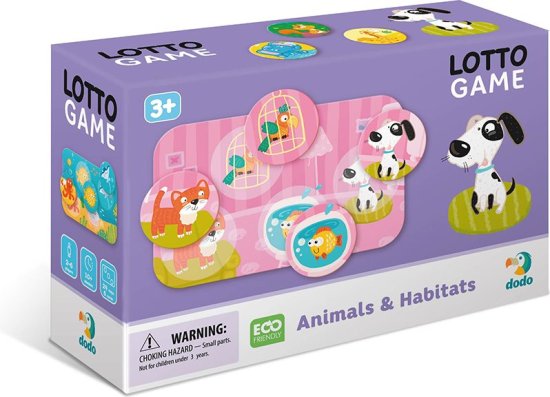 Zabavna otroška igra Lotto otrokom predstavi svet živali. Princip igre je podoben klasičnemu Bingu. Vsak igralec izžreba eno kartico in jo nato poskuša zapolniti z ustreznimi slikami. Kdor prvi uspe zapolniti svojo kartico, zmaga. Paket vsebuje: