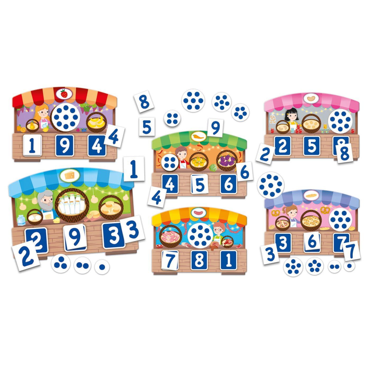 Vsebina paketa: 6 igralnih plošč za bingo z različnimi stojnicami in ponujenim blagom, 18 pravokotnih elementov s številkami, 18 okroglih elementov s simboli količin, vrečka iz ekološkega bombaža, učni priročnik Priporočena starost: 3–6 let Pakiranje: 18,6 × 25,5 × 6,9 cm