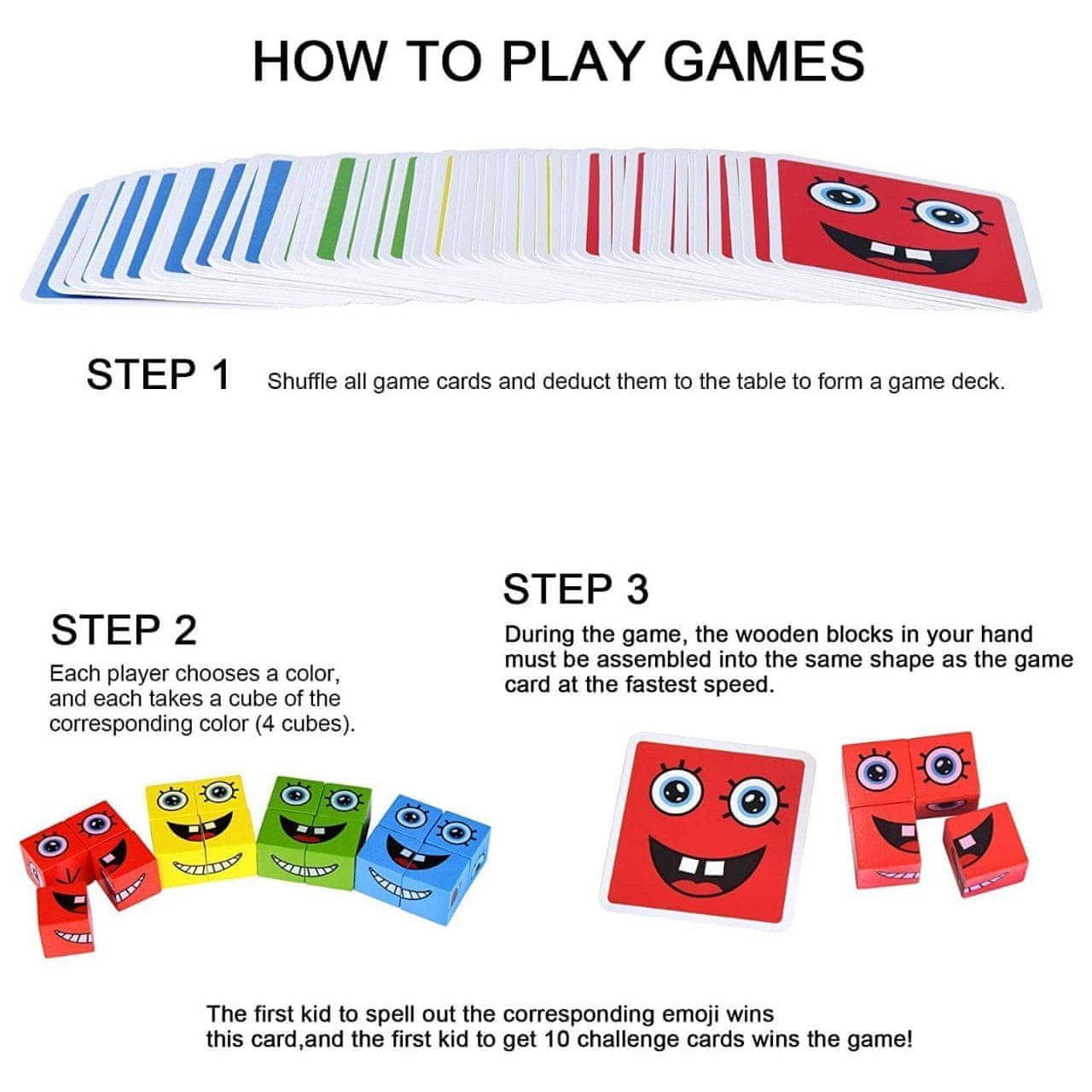 Otrok izbere kartico z obraznim izrazom in s pomočjo lesenih kock sestavi enak izraz. Igra omogoča pogovor o čustvih, spodbuja empatijo ter razvija sposobnost opazovanja in izražanja. Priporočljivo za skupno igro otrok in odraslih.