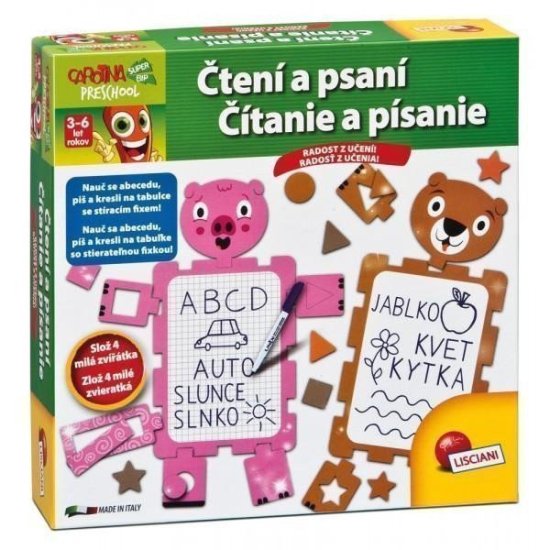 Serija PRESCHOOL!Ta izobraževalna igra iz Carotine vsebuje dve plošči, na kateri je mogoče pisati z obeh strani, zato se otroci na igriv način učijo brati, pisati in barvati. Na eni plošči so črke in imena živali v abecednem vrstnem redu. Druga tabla je na eni strani