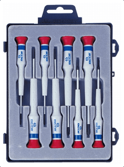 King Tony komplet natančnih izvijačev v plastični škatli z visečim ročajem. Komplet za natančno delo, ki ga lahko naredite sami. Komplet vsebuje 8 izvijačev velikosti 000×40, 00×40, 0×40, 1×40 in ravnih 1,5×40, 2,0×40, 2,5×40, 3,0×40.