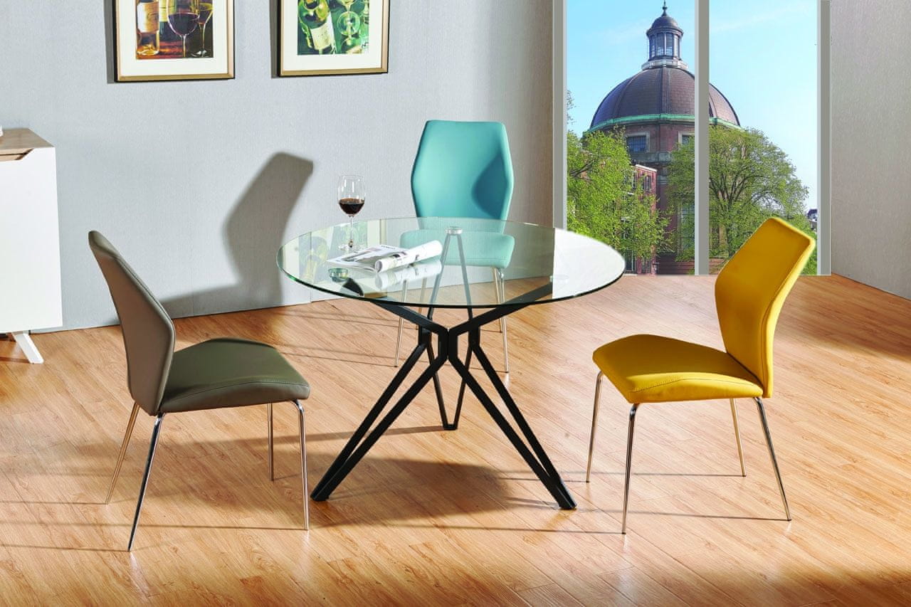 Okrogla miza OXFORD (120 cm) s kaljenim prozornim steklom in črnimi nogami se bo odlično podala v vsako jedilnico.