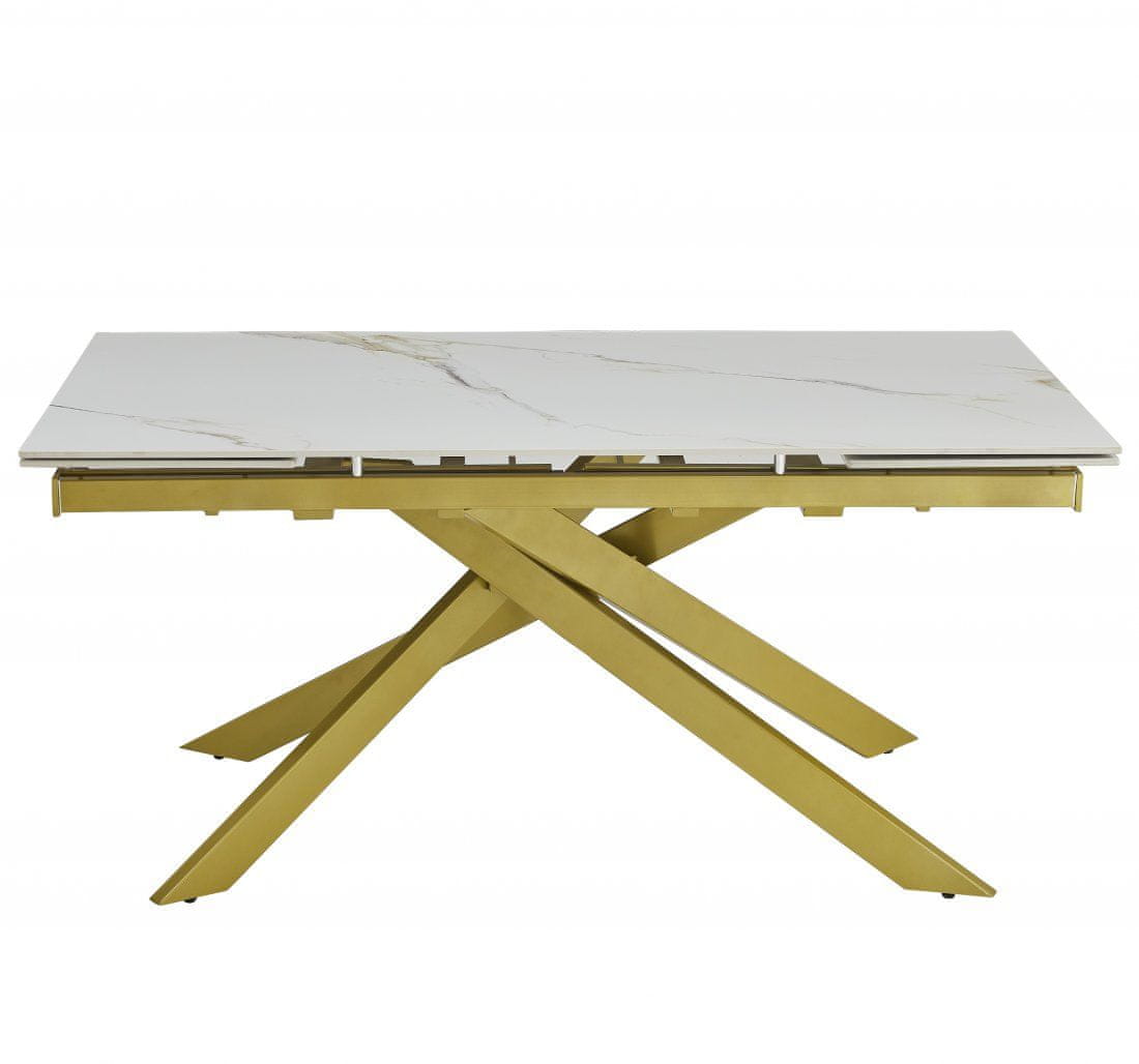 Raztegljiva jedilna miza GOLDIE 160+40+40 (bela/zlata) združuje sodobno prilagodljivost in klasično razkošje, idealna za vsako jedilnico.